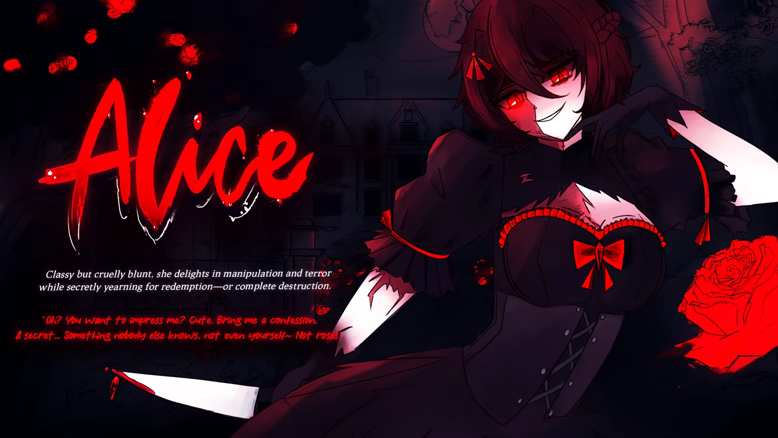 Alice: A classy, but cruelly blunt ghost with a psychotic streak and a dark past. A chaotic, malicious spirit who may hold ulterior motives for this game.
