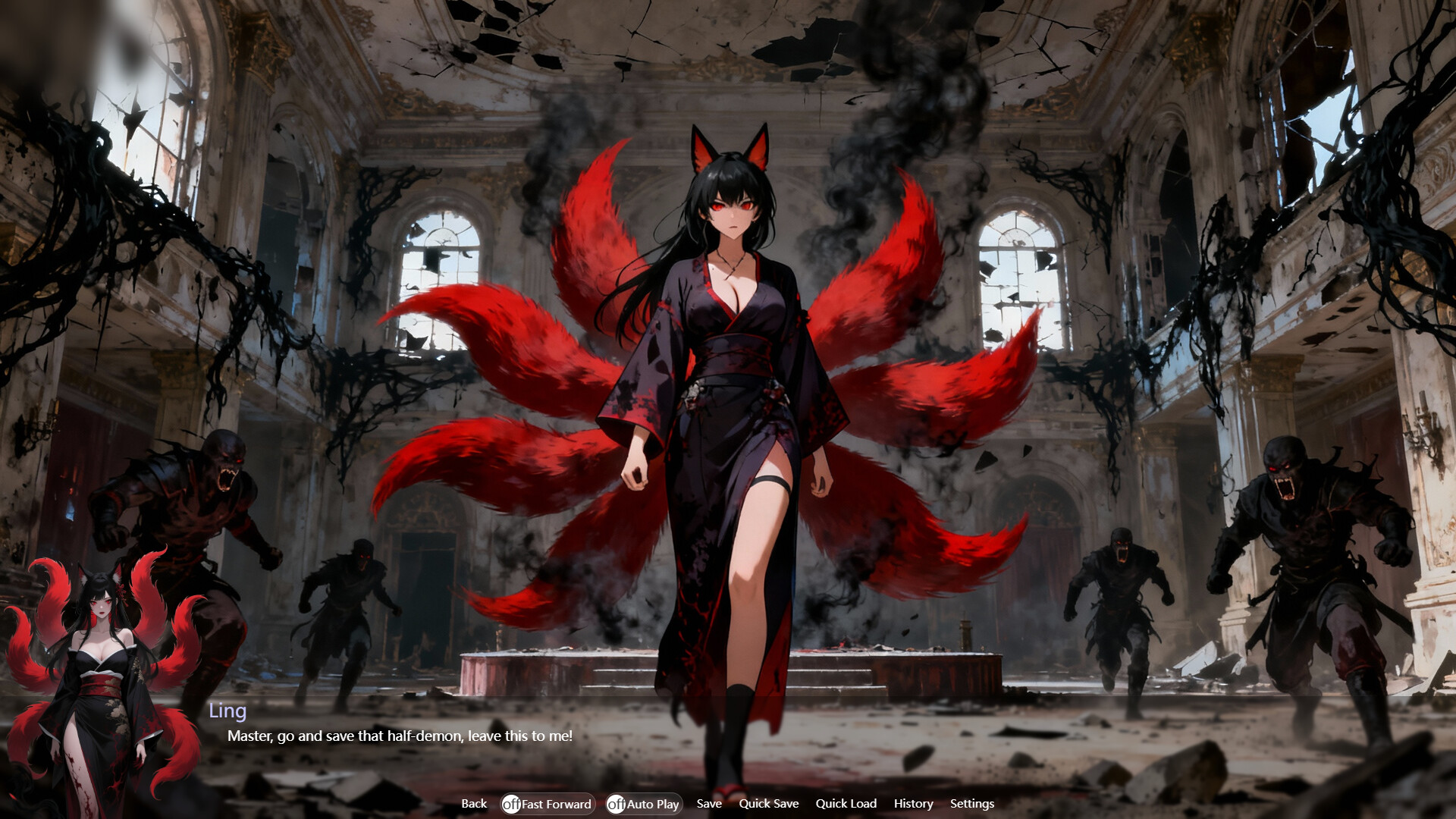"Crimson Moon Demoness Ling": Once a bloodthirsty henchman of the Demon King, she became a "slave" after you lifted her blood curse. She will tear apart powerful enemies for you in battle, but will also reveal her vulnerability when alone.