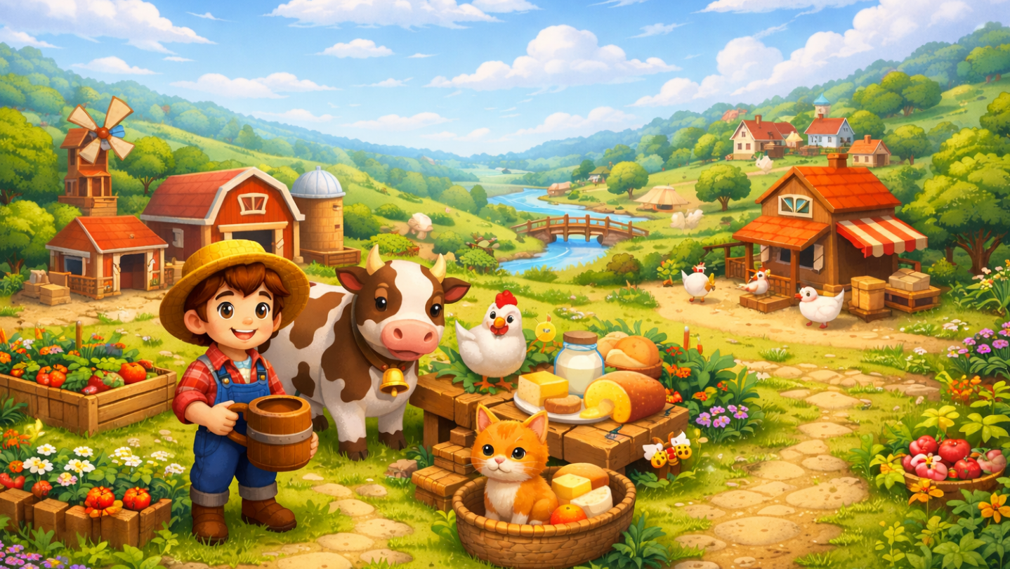 A cozy farming game where you grow crops, raise animals, freely build and move farm structures, craft products, and sell fresh goods to villagers in a peaceful, cartoon-style world.