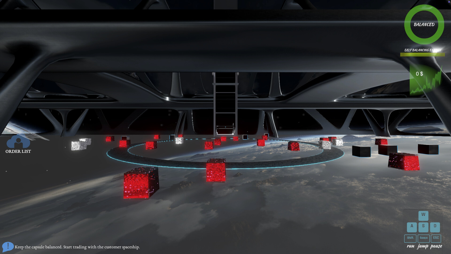You are a space trader living inside a capsule in deep space. Supply passing starships, maintain balance in a weight-based physics system, and build your own space colony.