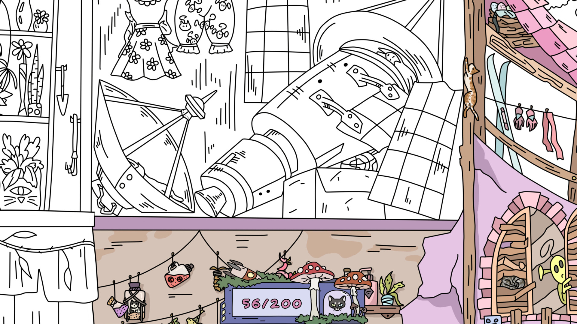 Discover new hand‑drawn scenes of a mysterious extraterrestrial world and find cleverly hidden cute cats. Each cat you uncover adds vibrant colors to the illustration, transforming paint black - white picture into a fantastic cosmic landscapes. Nice relaxing background music will provide complete relaxation. Suitable for the whole family.