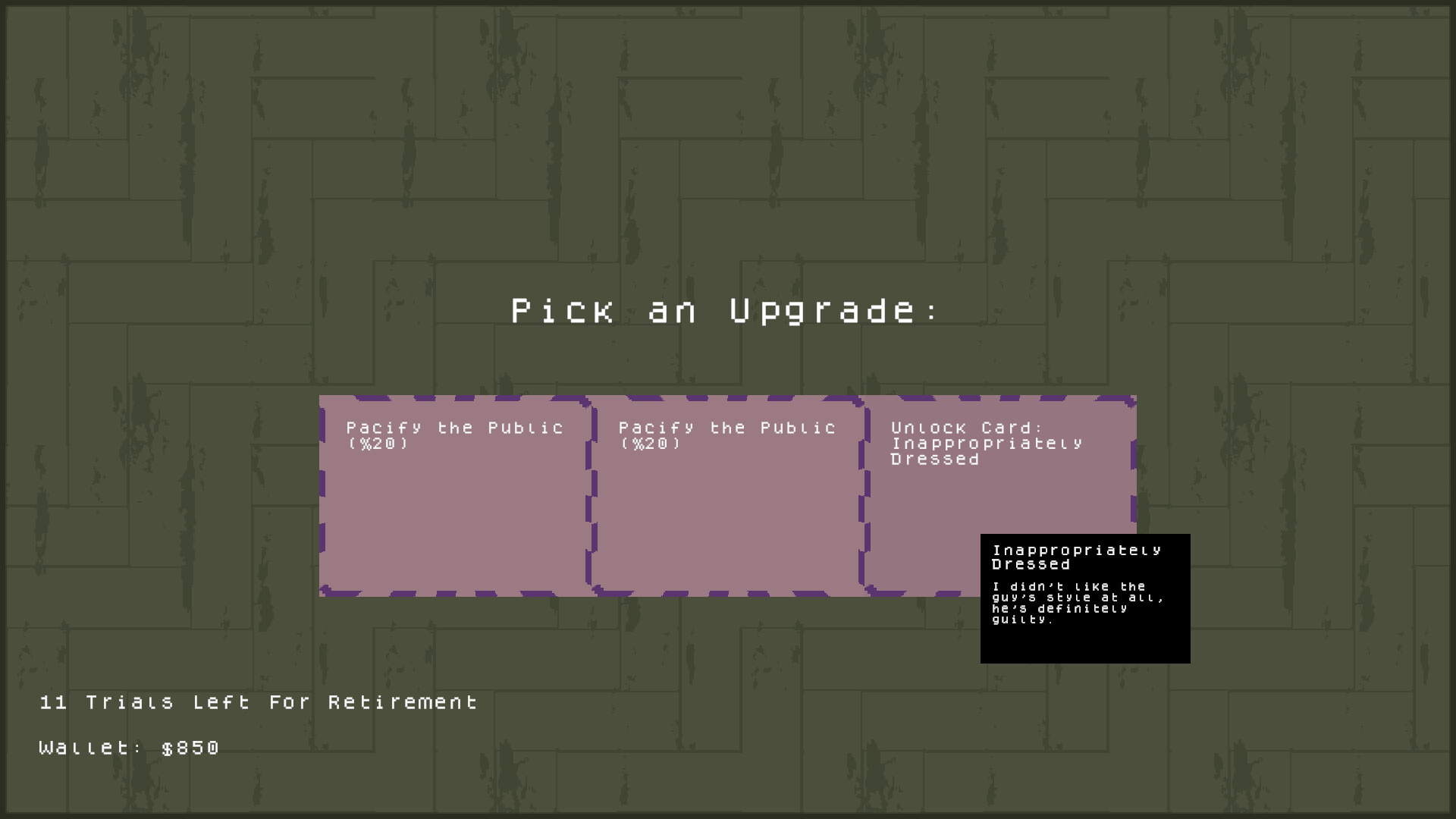 “Your Price, Your Honor.” is a game where you control the choices of a judge who is getting close to retirement. You must manage the public’s tolerance for injustice… and your own wallet.