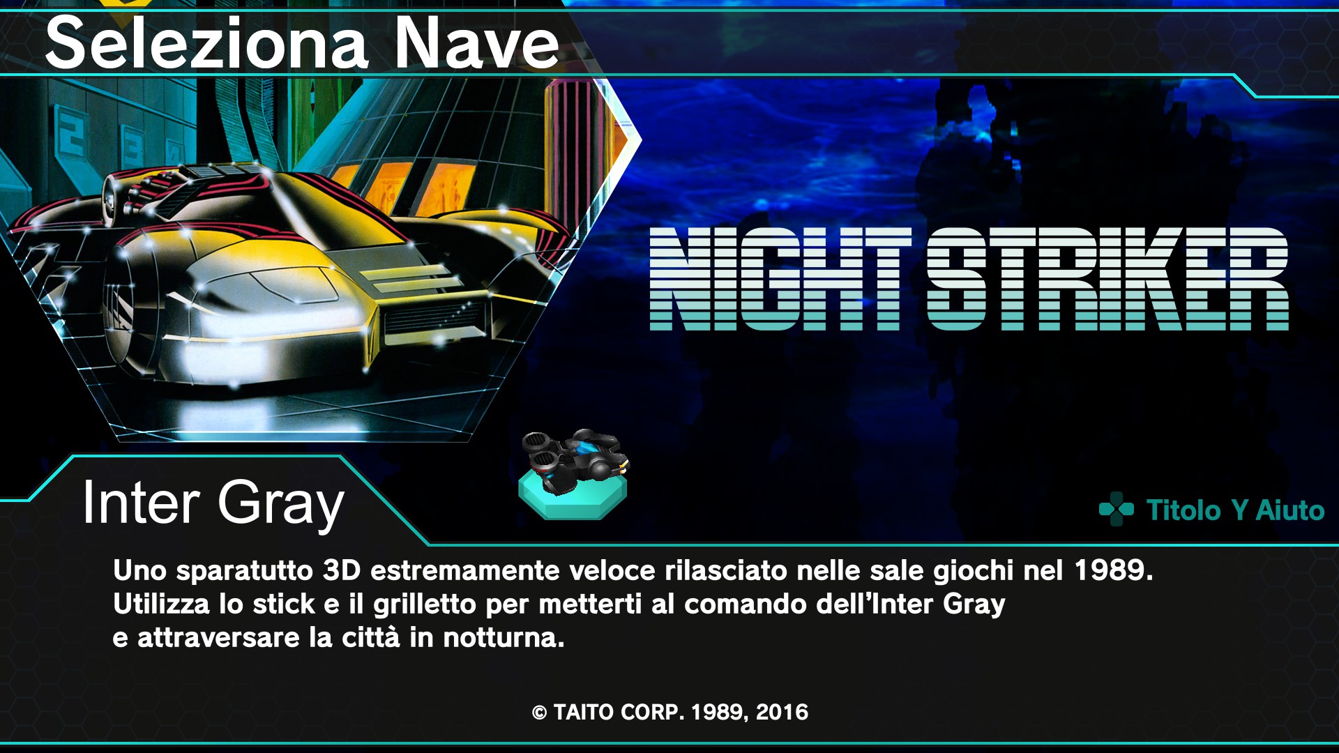 Direttamente dal mitico gioco arcade con joystick analogico e grafica pseudo 3D, arriva Night Striker. Pilota la Inter Gray nei livelli a scorrimento 2D e abbatti i nemici con i tuoi missili guidati.