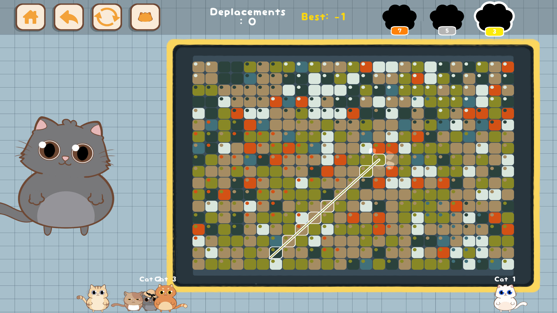 Optimize your moves to aim for the golden paw and collect each artist's cat to keep you company. Cats are wandering on your screen, but you can also pick them up and move them as you wish. You can even customize them with 18 hats to unlock.