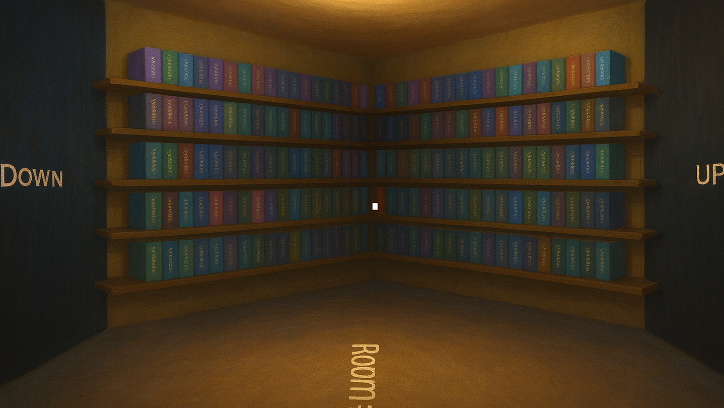 is an infinite exploration game inspired by Jorge Luis Borges’ 1941 short story. Wander through endless rooms filled with countless books, each containing pages of random text. Every step deeper into the library confronts you with the vastness of infinity, where meaning, chaos, and discovery coexist. Explore, search, and lose yourself in a world where every possible book exists—and finding anything at all is part of the mystery.