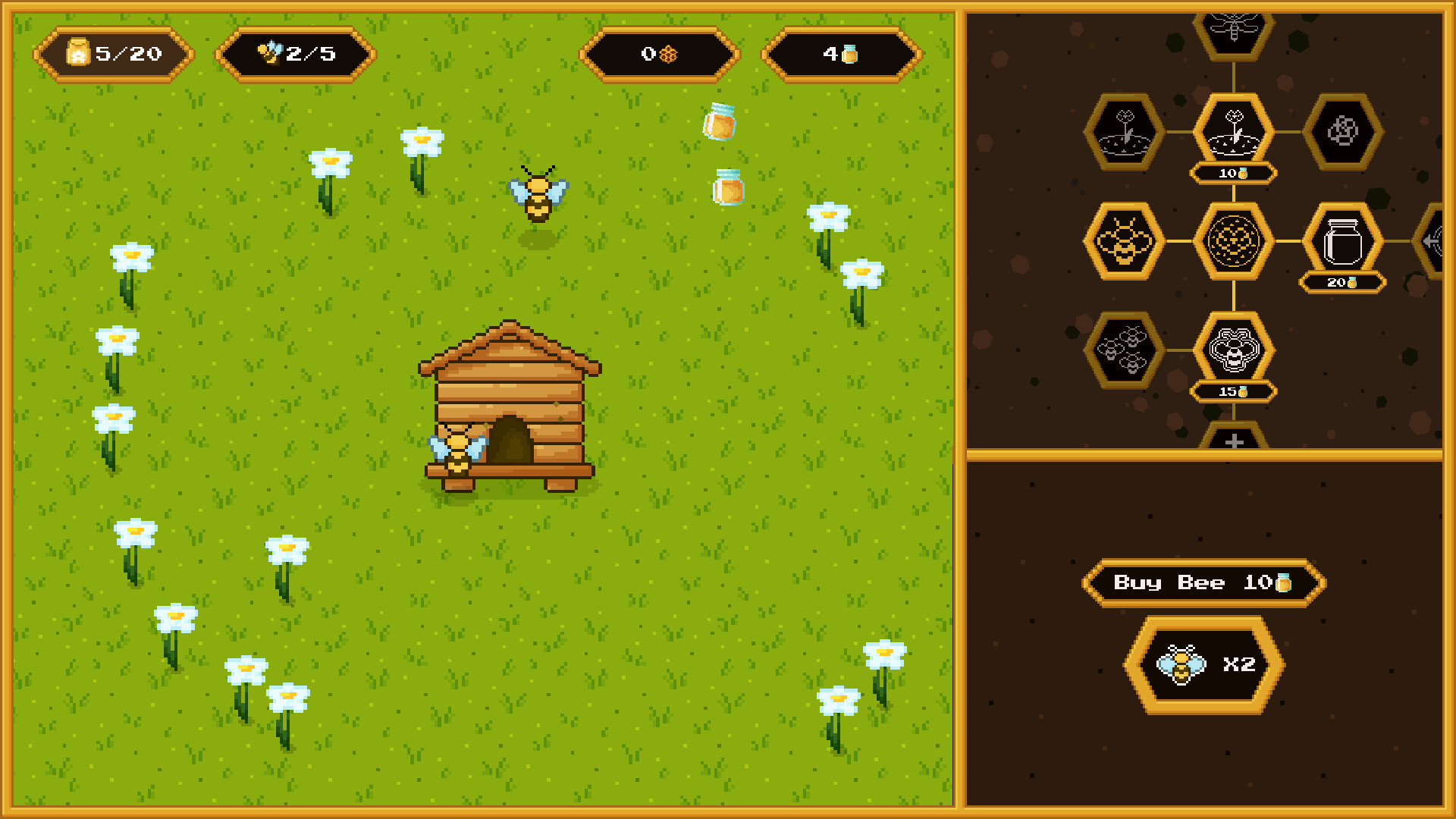 Сажайте цветы по всей территории и наблюдайте, как ваши пчёлы автоматически вылетают за нектаром и возвращают его в виде мёда. Используйте полученные ресурсы, чтобы открывать улучшения, эволюционировать пчёл в более сильные формы и определять, как ваш улей будет развиваться со временем.