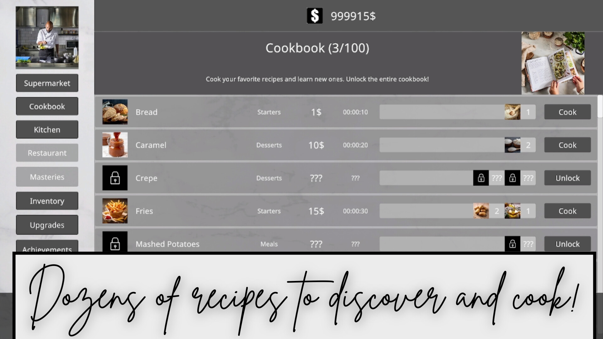 Di Professional Chef, ubah bahan-bahan sederhana menjadi hidangan lezat. Beli, masak, jual, tingkatkan, dan buka resep baru. Optimalkan prosesmu, kuasai setiap detail, dan raih keunggulan kuliner dalam pengalaman memasak idle yang seru ini!