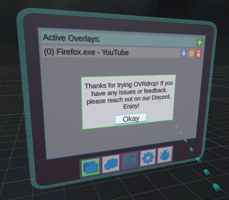 OVRdrop 2 aims to be highly configurable with nearly infinite possible configurations. Some user configuration may be required for all experiences. VR Tracked Controllers are required for most interactions. OVRdrop 2 requires Windows 10 or newer. Not all applications can currently be captured. Some applications may refuse capture due to DRM/DMCA restrictions. Some applications may refuse capture due to technical limitations. Please report any incompatibilities on our Discord and we'll get right on it! OVRdrop 2 runs on SteamVR and can only render to your headset when SteamVR is rendering. If you cannot see the SteamVR Dashboard menu in VR, you will not be able to see OVRdrop 2. The Dashboard does not need to remain open while using OVRdrop 2, but if you can't ever open the Dashboard, SteamVR is not rendering to the headset. Some games will prefer to use native rendering pipelines which prevent OVRdrop 2 from rendering, particularly when using certain HMDs.