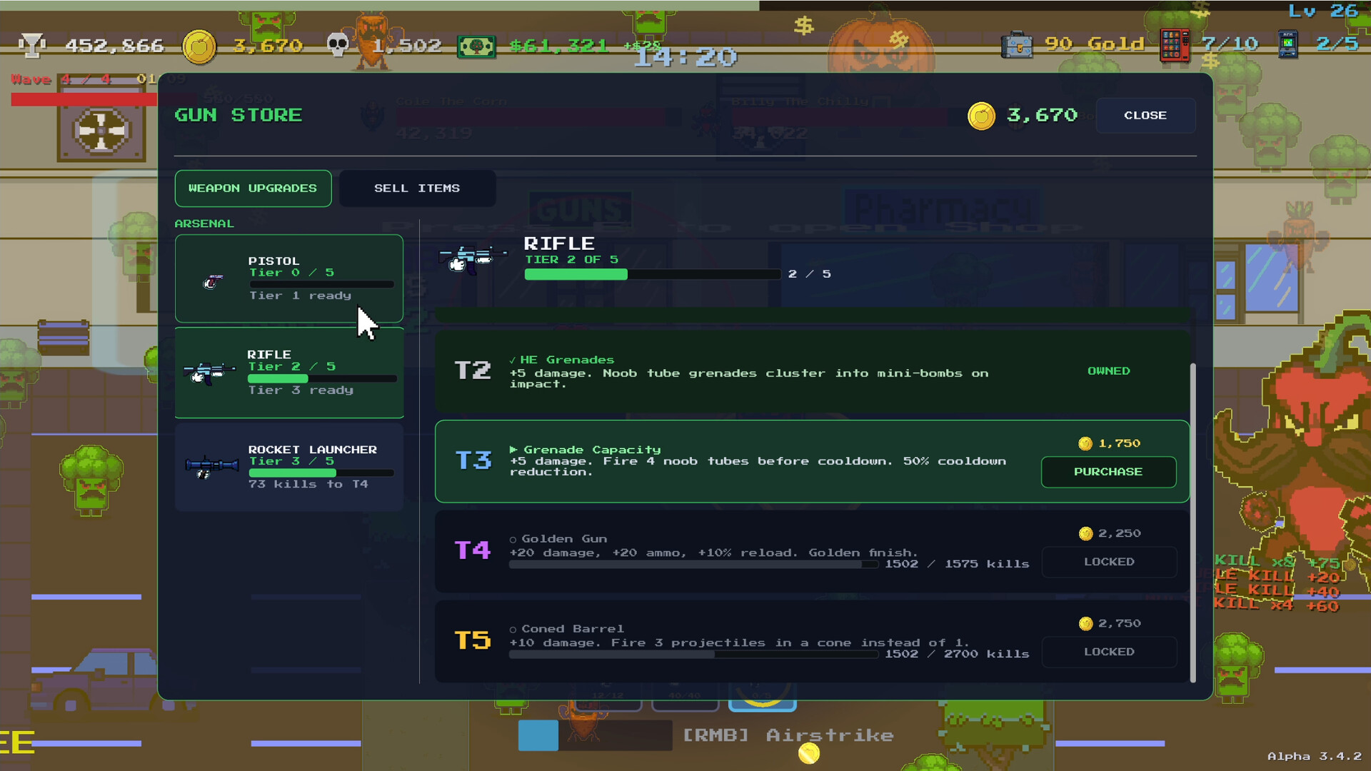 Apple man Sam versus moustached vegetables. A top-down survivors-like roguelite where you pick a loadout, level up, upgrade your weapons, and loot items to blast through escalating hordes and bosses. Multiple loadouts, endless mode, and leaderboards. Complete quests to unlock items and cosmetics!