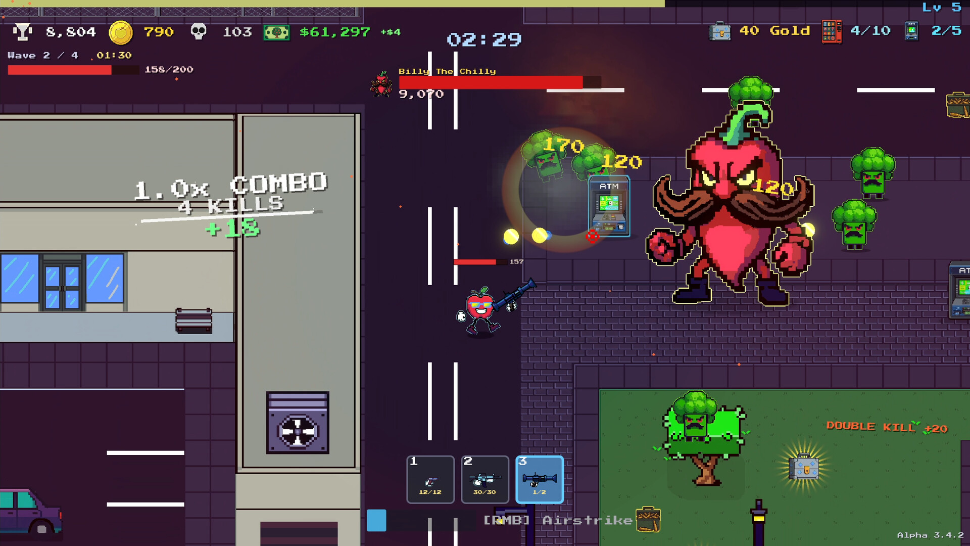 Apple man Sam versus moustached vegetables. A top-down survivors-like roguelite where you pick a loadout, level up, upgrade your weapons, and loot items to blast through escalating hordes and bosses. Multiple loadouts, endless mode, and leaderboards. Complete quests to unlock items and cosmetics!