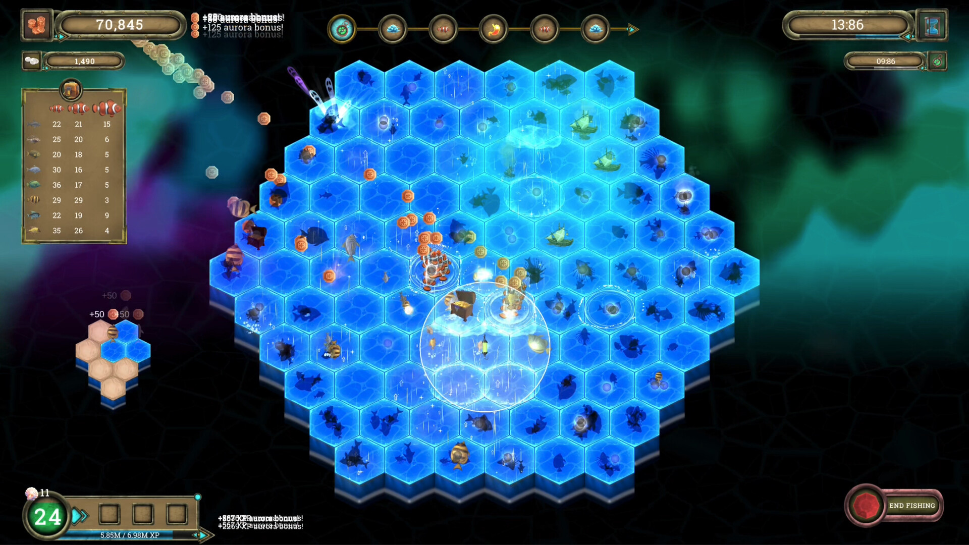 More fish es un sencillo juego clicker incremental. EXCEPTO QUE NORMALMENTE NO HACES CLIC. Pasa el cursor sobre los peces para pescarlos. Tu cursor se convertirá en una boya cuando estés sobre casillas de océano. Al final de cada ronda, mejora diversos elementos y sigue pescando en la siguiente.