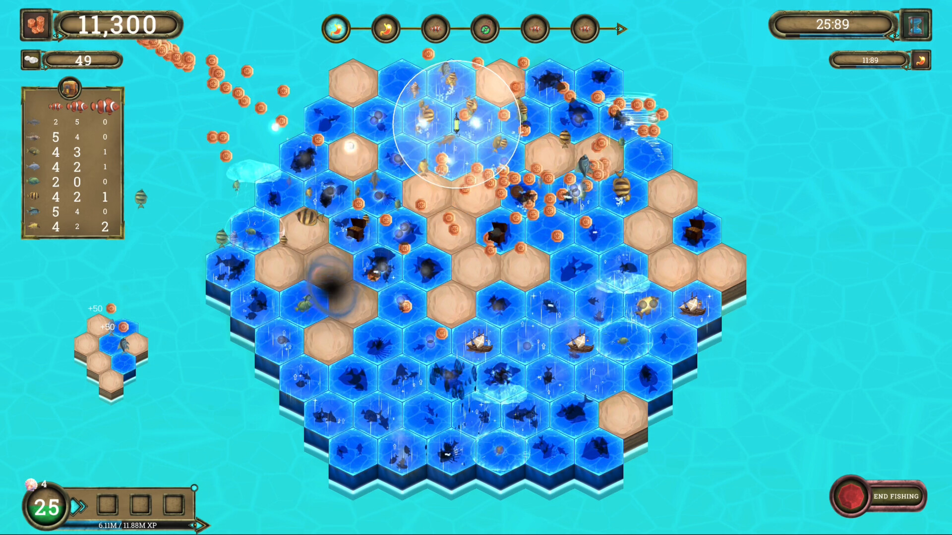 Thống kê hiển thị sức mạnh của phao câu bao gồm tất cả các nâng cấp. Ví dụ: hiệu quả thu thập tiền vàng và ngọc trai của bạn thay đổi thế nào theo thời gian? Loại cá nào bạn bắt được nhiều nhất?