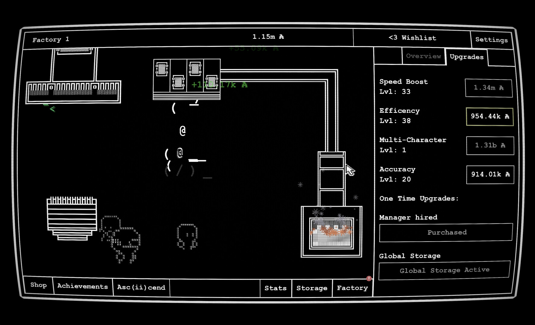 Expand your production facilities to generate even more ASCII art. With each new factory, you increase your capacity and thus your revenue. Purchase upgrades for your factory to boost production and max out your ascii art creation processes.