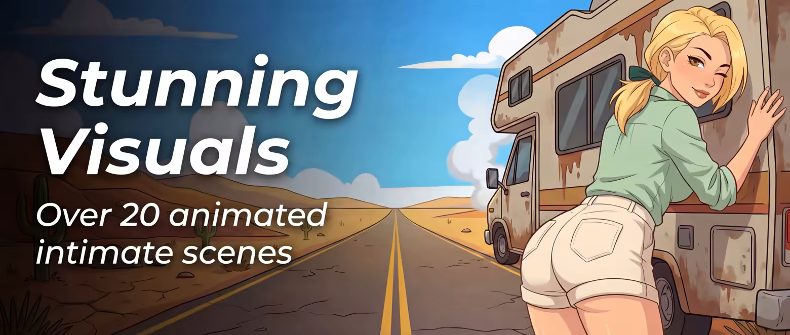 Experience over 20 (4 available in Demo) meticulously crafted intimate scenes with fluid frame-by-frame animation. From steamy motel mishaps to breakdown-side encounters, each situation is brought to life through detailed artwork that balances raunchy comedy with genuine heat.