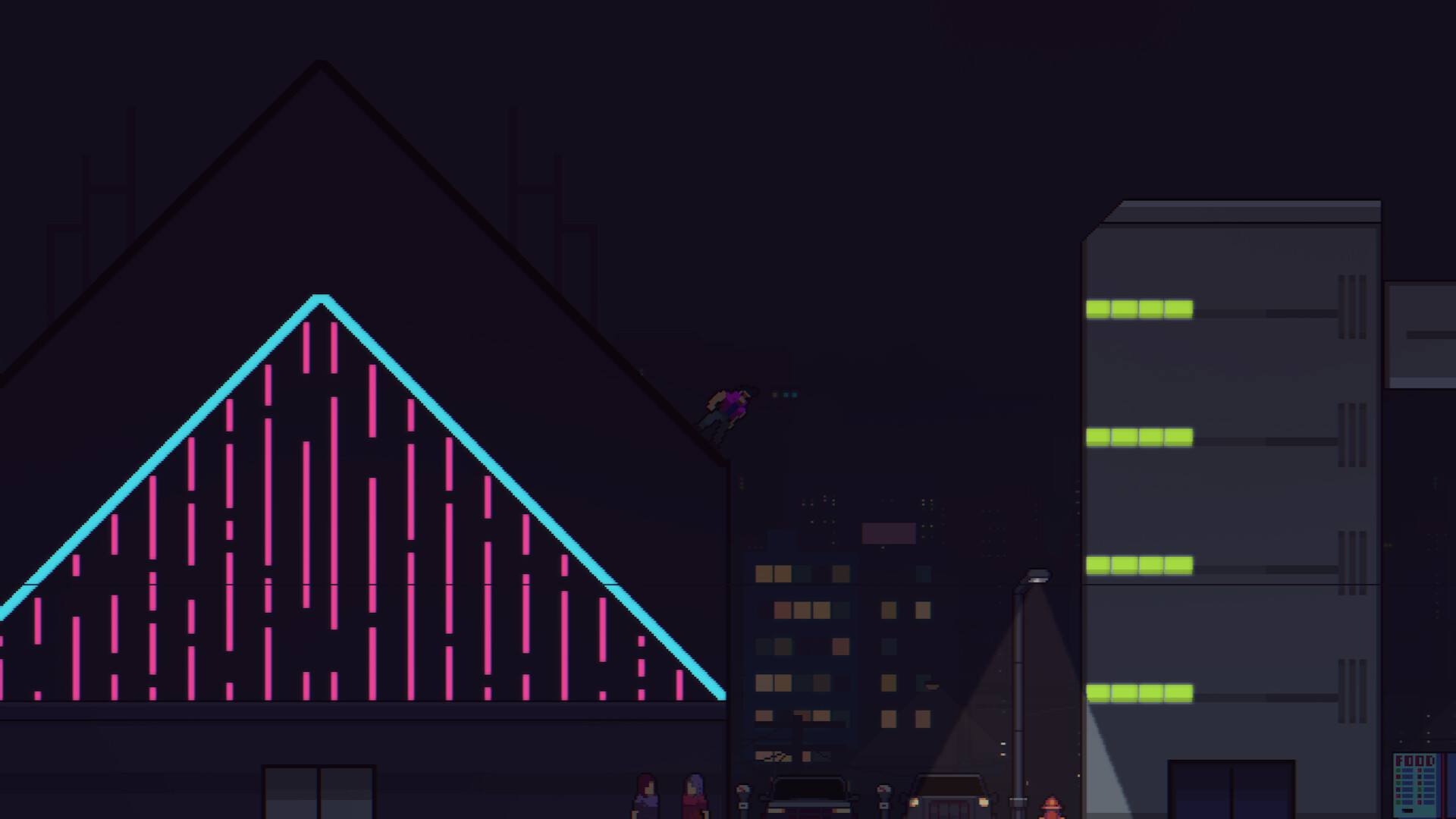 • Stylized pixel art visuals in a retro futuristic cyberpunk city