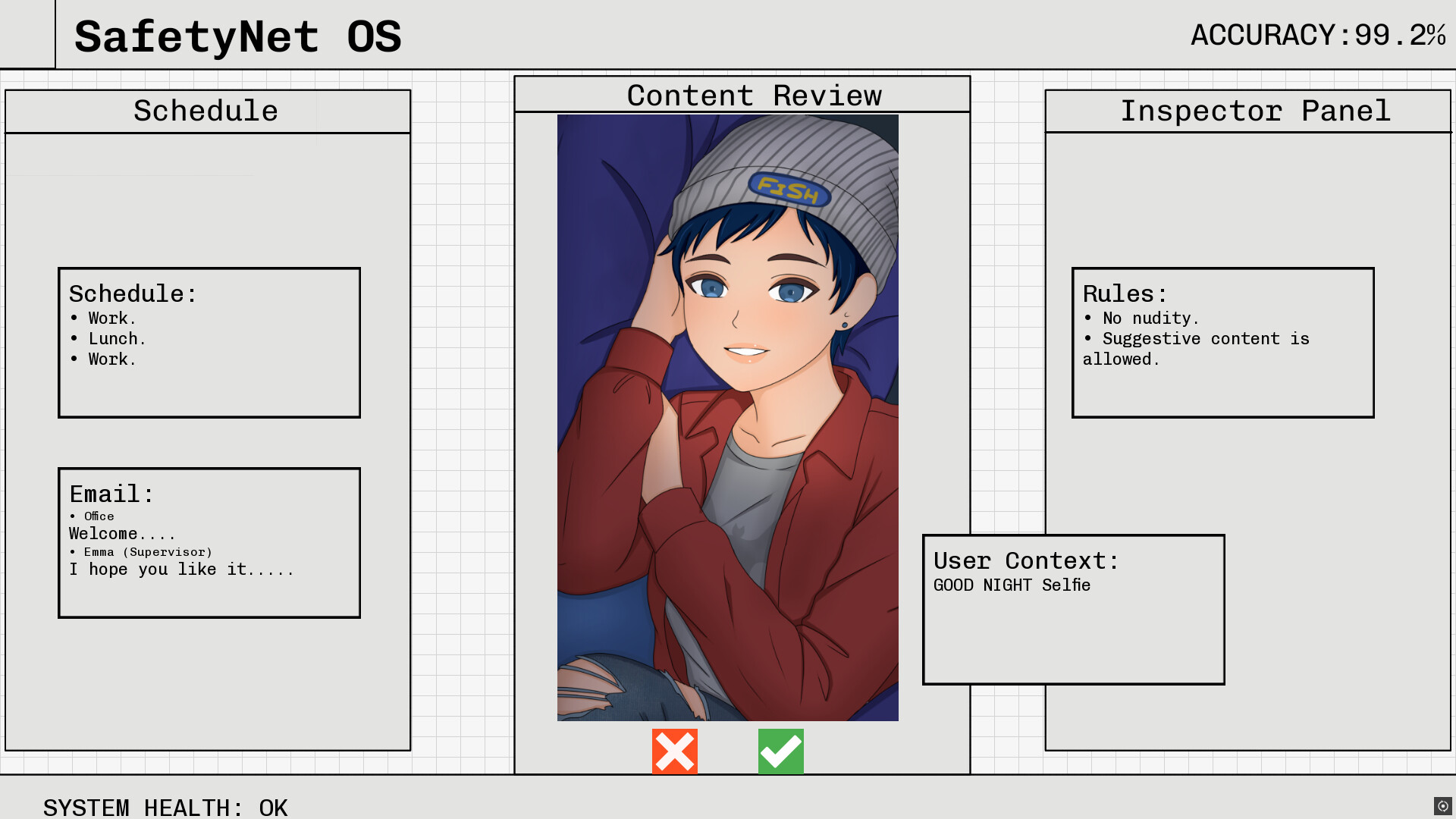 Moderate a fictional social media app. Approve or reject posts based on platform policies, avoid mistakes, and navigate workplace Relationships.