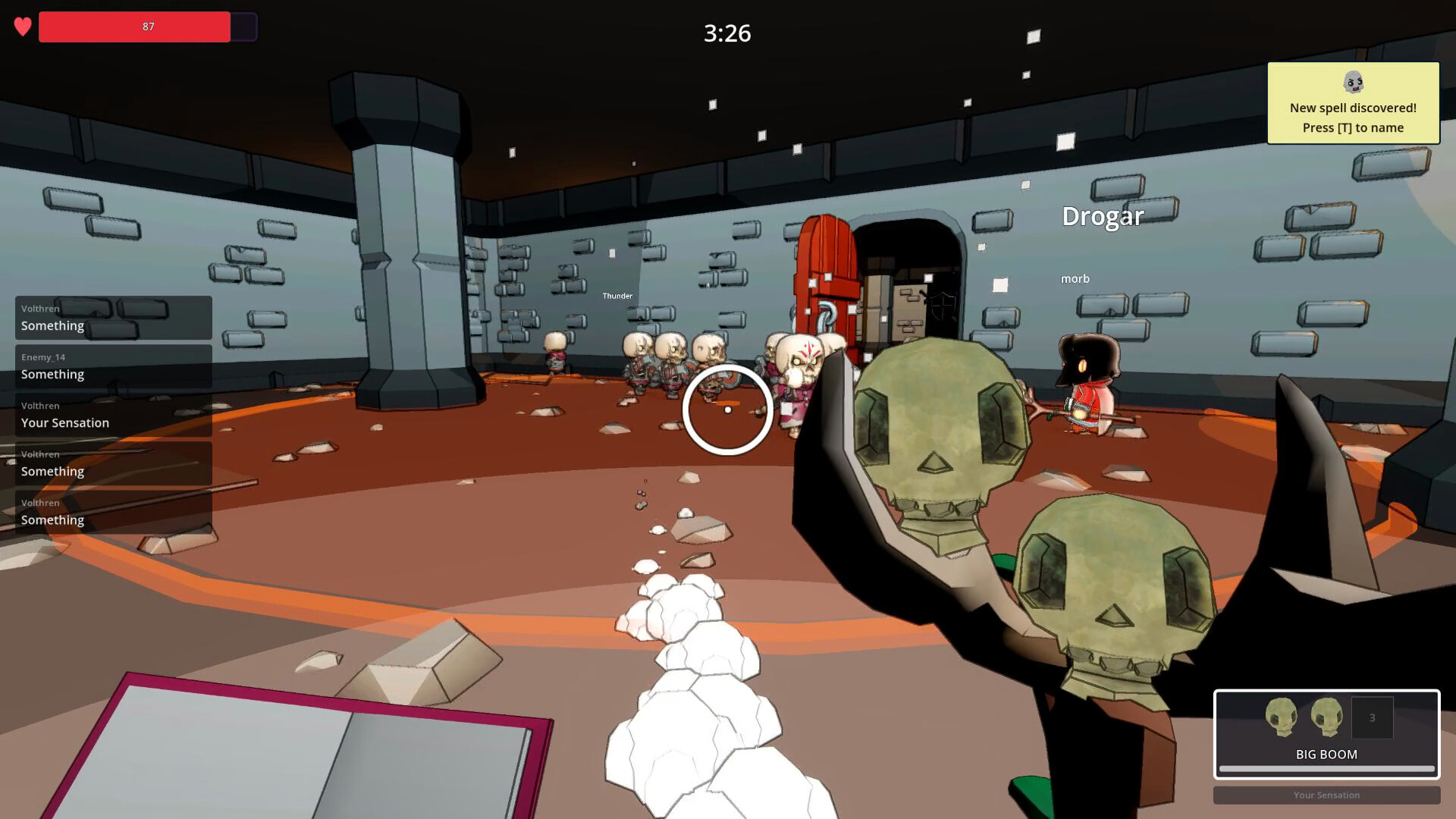 This is a demo of Tome Improvement. A co-op dungeon crawler where you and your friends name the spells. Catch critters, combine them in your staff, and hope your friends remember which spell is "DIVORCE BEAM" when you are surrounded by skeletons.