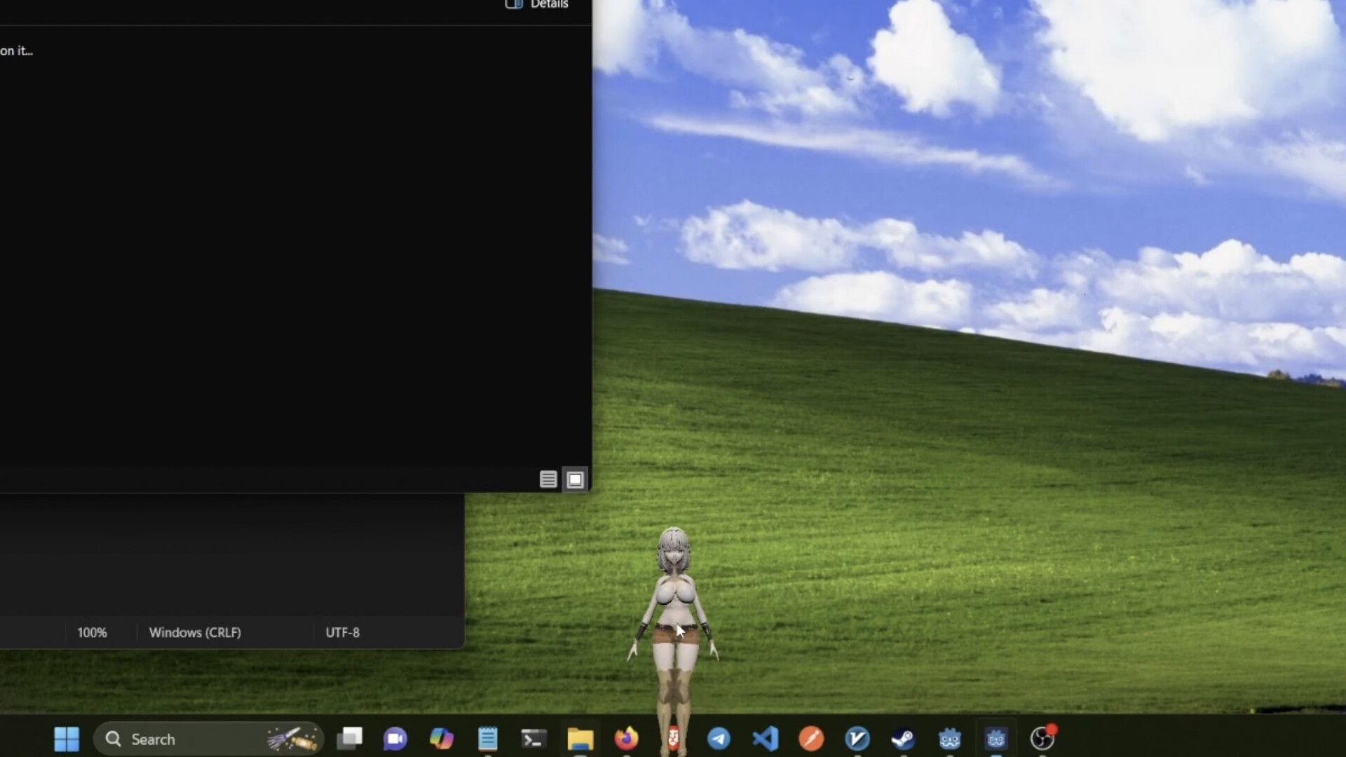 She lives on your desktop, not in a window. Drag her onto your actual application windows. Drop her. Watch physics do its thing. She'll collide with your taskbar, rest on your browser, and generally make your workspace more chaotic (affectionately).