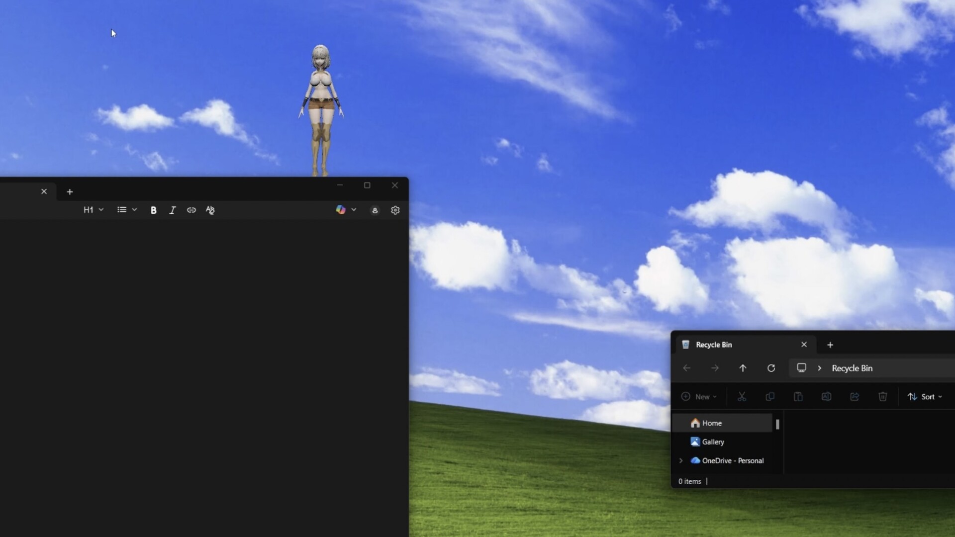 She lives on your desktop, not in a window. Drag her onto your actual application windows. Drop her. Watch physics do its thing. She'll collide with your taskbar, rest on your browser, and generally make your workspace more chaotic (affectionately).