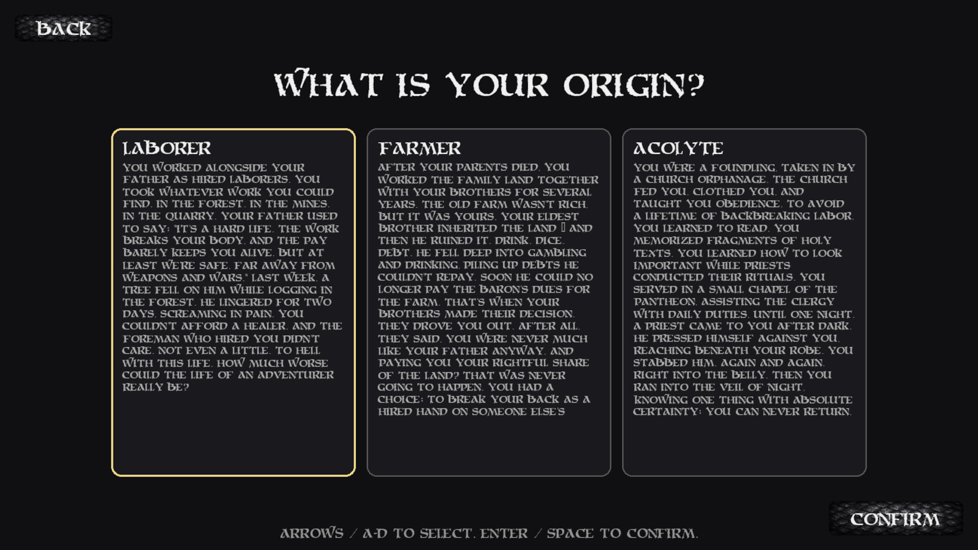 You begin as an outsider — a Laborer, Farmer, or Acolyte — and carve your own path through dangerous dungeons, brutal combat, and meaningful choices. From humble origins to growing power, your journey defines who you become.