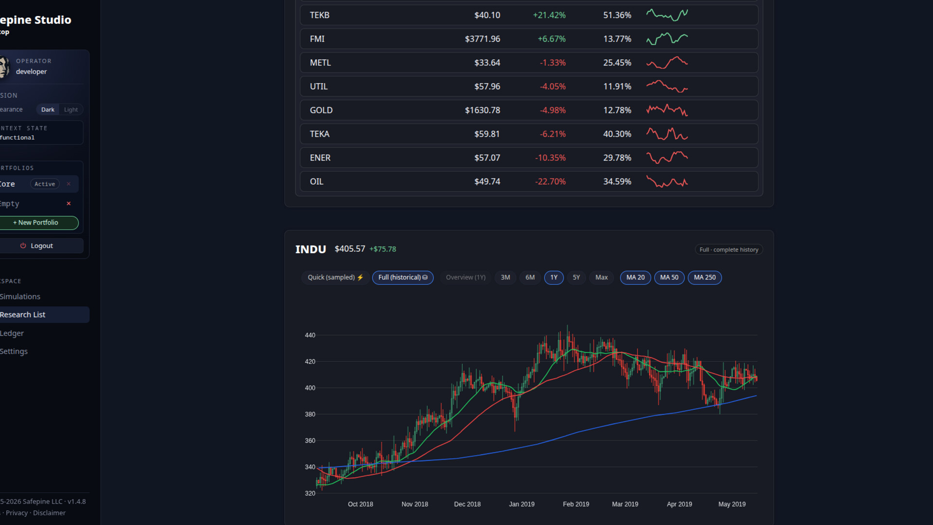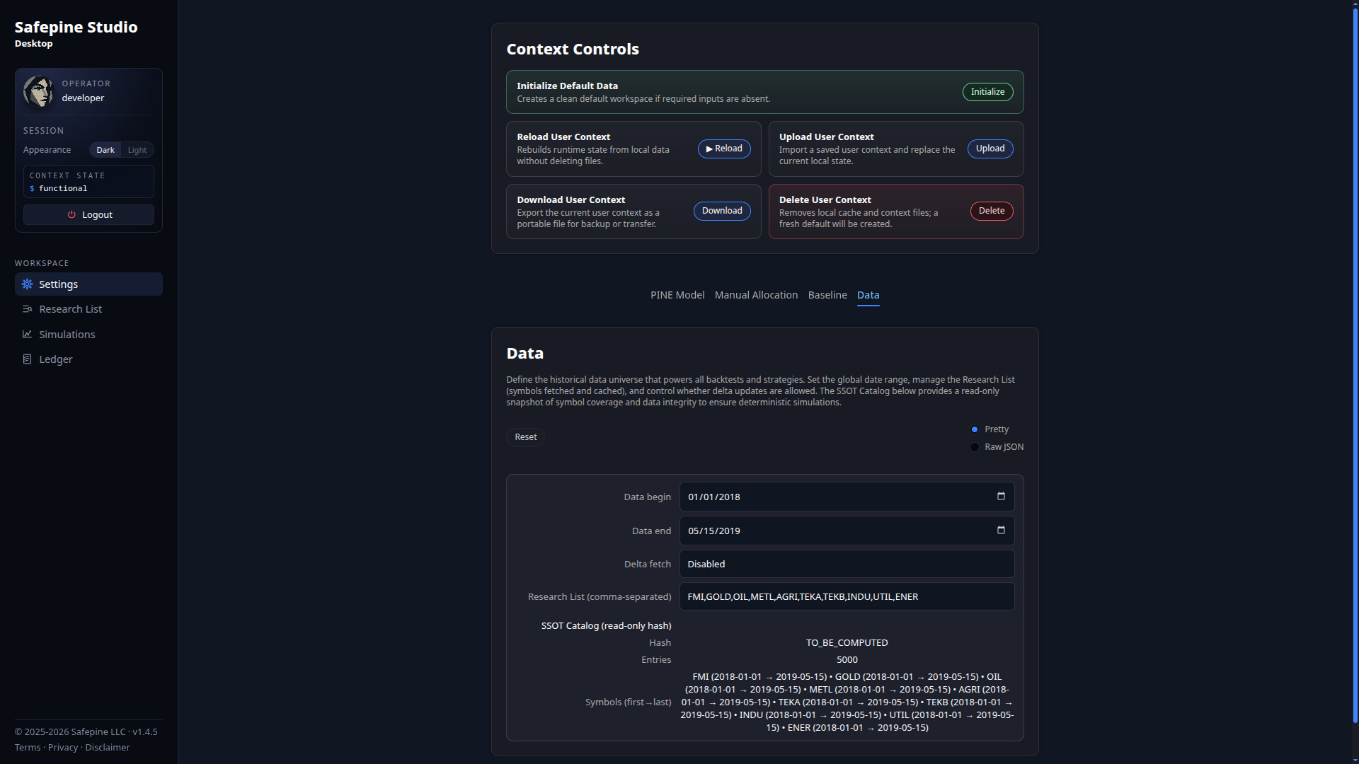 Safepine Studio is a Linux-native research environment built for learning how structure affects decisions and system design. It enables individuals to explore market behavior through back-testing within fully reproducible workflows. Users begin with curated synthetic data and may optionally load their own CSV files for deeper analysis.