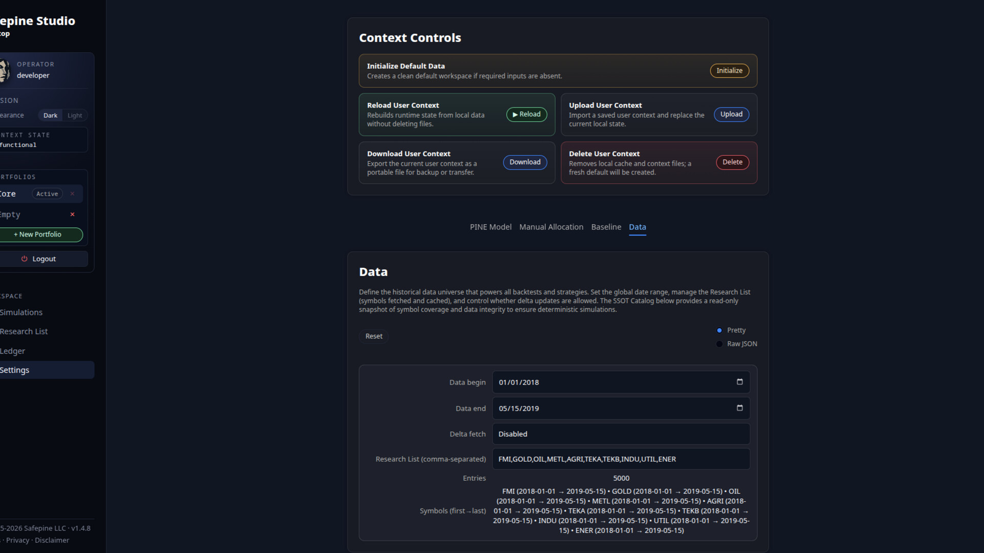 Safepine Studio is a Linux-native research environment built for learning how structure affects decisions and system design. It enables individuals to explore market behavior through back-testing within fully reproducible workflows. Users begin with curated synthetic data and may optionally load their own CSV files for deeper analysis.