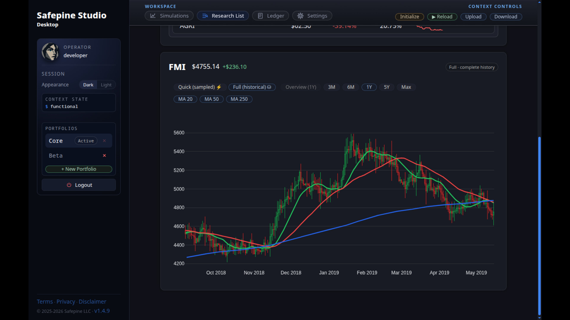 Safepine Studio is a Linux-native research environment built for learning how structure affects decisions and system design. It enables individuals to explore market behavior through back-testing within fully reproducible workflows. Users begin with curated synthetic data and may optionally load their own CSV files for deeper analysis.