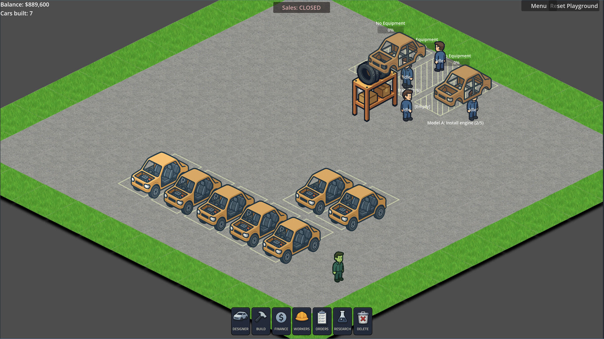 Build cars step-by-step in a factory sim. Design vehicles, build your garage layout, hire and train workers, manage parking inventory, and sell cars through customer orders or walk-in buyers as you expand your operation.
