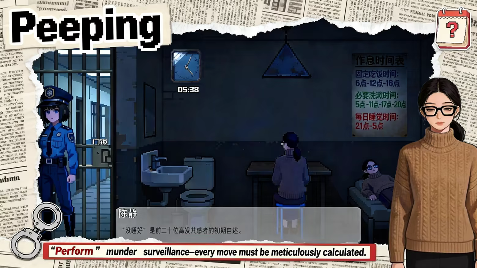 Peeping​ is a psychological survival game where you, a detained "supernatural suspect," must balance pretense and madness during a 31-day prison observation.