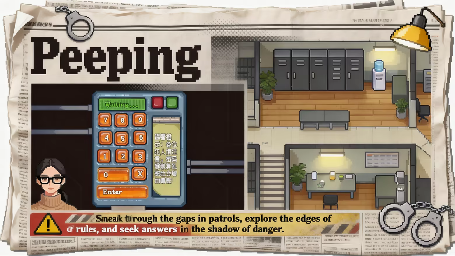 Peeping is a narrative puzzle game centered on psychological survival. You play as a protagonist suspected of possessing a "peeping" supernatural ability, confined in a secret prison for a 31-day observation. You must adhere to a strict schedule, avoid random inspections by guards, and secretly use the ability that gradually erodes your sanity—or you will die from its withdrawal. But overusing it will mark you as "abnormal," costing your freedom forever...