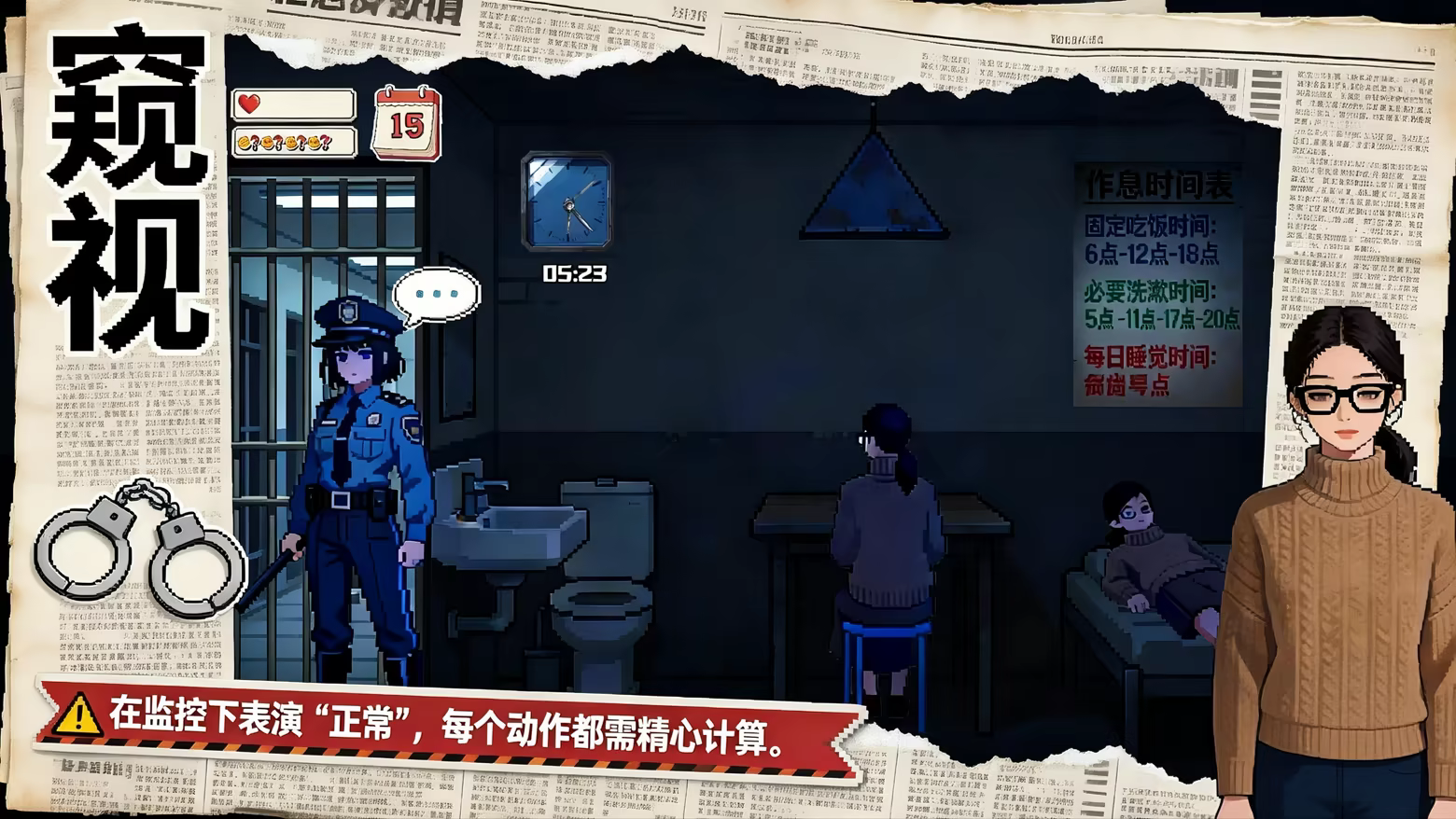 《窥视》是一款以心理生存为核心的叙事解谜游戏。你扮演一名疑似拥有“偷窥”能力的主角,被关押在秘密监狱中接受为期31天的观察。你必须遵守严苛的作息表、躲避狱警的随机巡查,并悄悄使用那日渐侵蚀理智的能力——否则,你将因能力反噬而死去。但若滥用能力,又会被判定为“异常”,永远失去自由……