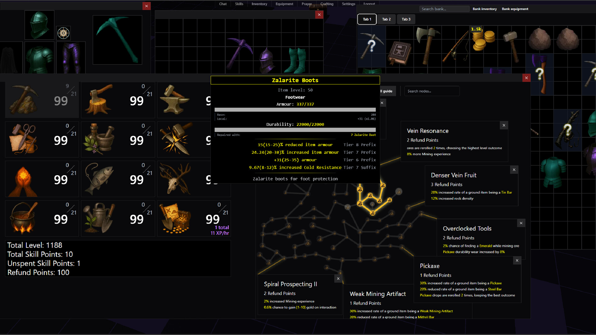 “The game is in active Early Access development. Currently features that are implemented include but not limited to skills, shared dynamic world objects that fatigue/transform over time, 2D grid inventories, item and skill tree affixes, unidentified/tradeable gear, automated + direct trading, permanent crafting stations, three minigames, monster-attack-only combat, planned task systems, multiple comprehensive crafting systems, and leaderboards.”