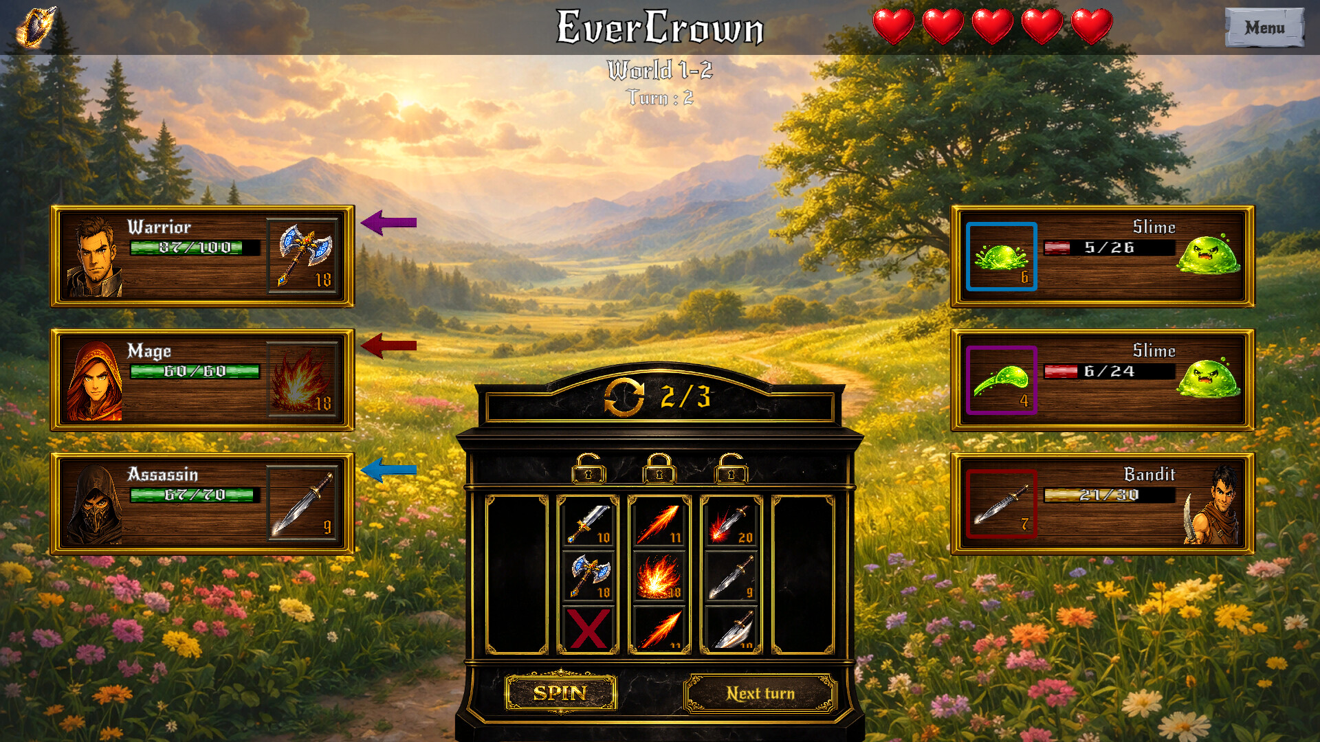 A turn-based tactical roguelike where your heroes’ actions are decided by a slot machine. Spin, lock, and reroll abilities, read enemy intentions, build powerful synergies, and push your run into explosive late-game scaling.