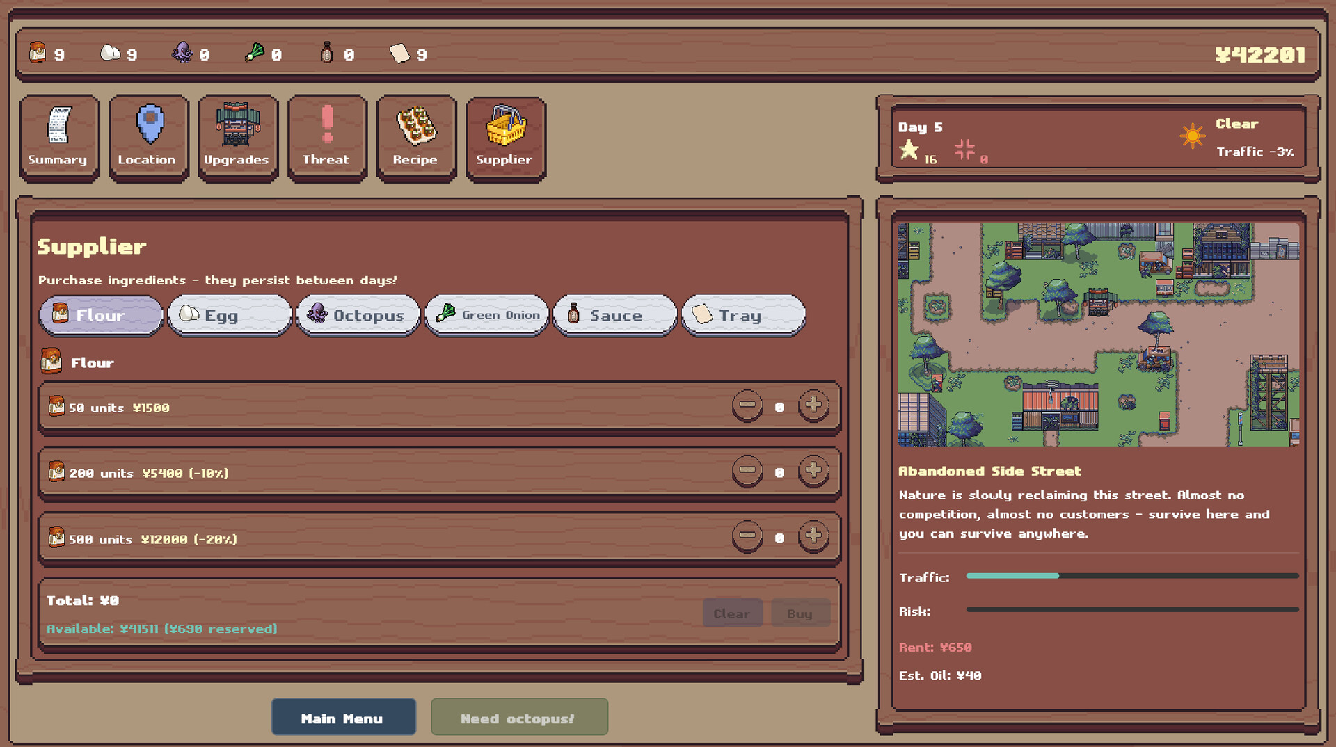 Street Takoyaki is a focused tycoon simulation game where you manage your stand in the streets of Japan. Choose where to operate, set your prices, manage ingredients, and survive the pressure as your business expands. There's no soft wins. You either adapt, or you shut down. Just like in life.