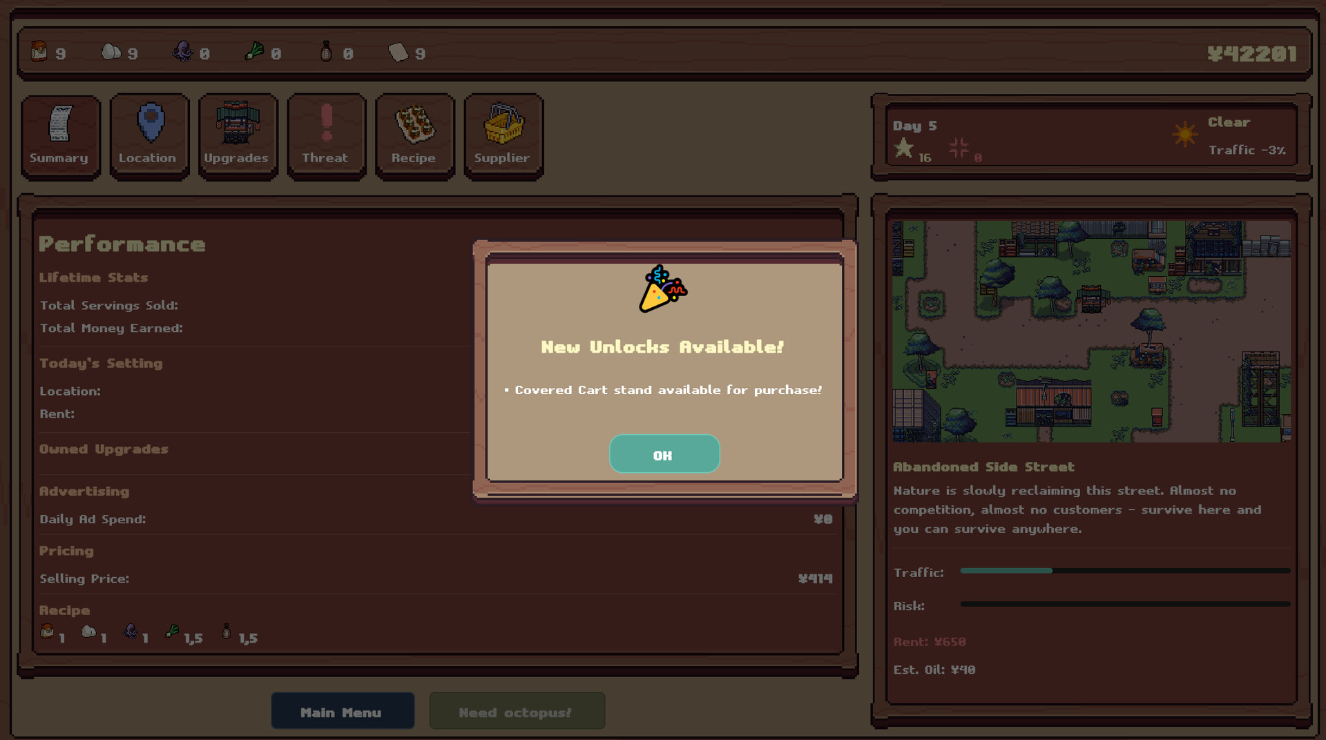 Run your very own takoyaki stand in the streets of Japan. Manage your ingredients, pricing, upgrades, and pressure from the police and yakuza in a survival-focused tycoon inspired by some classics.