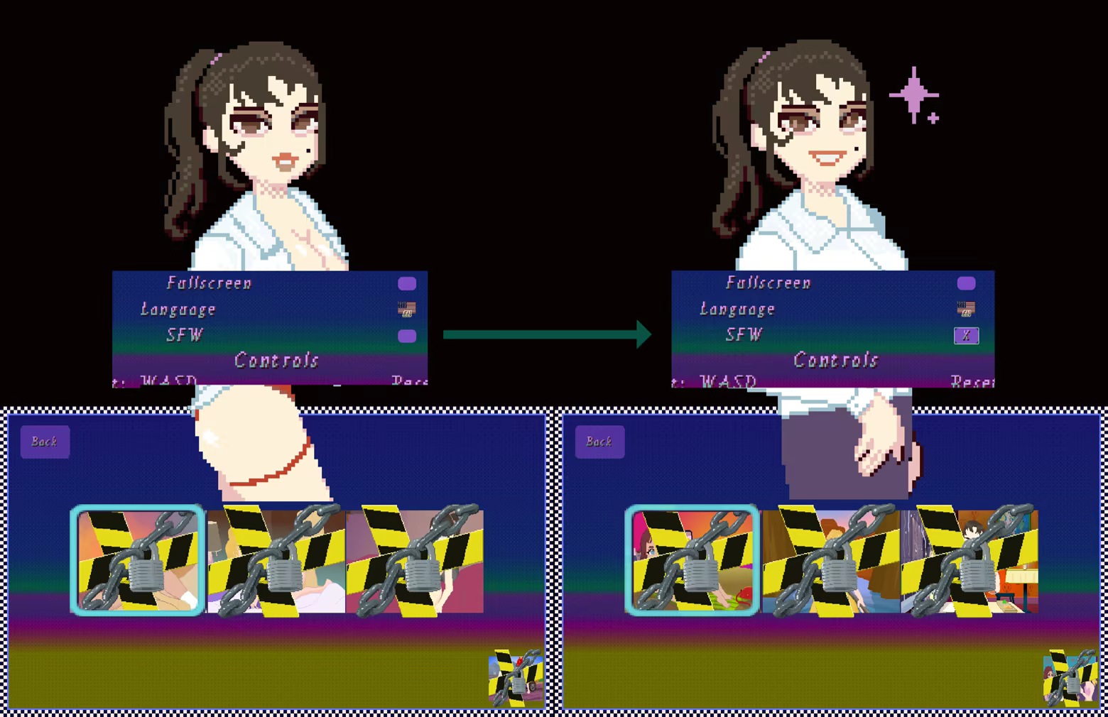 Unlockable thumbnails of sensual pixel-art animations