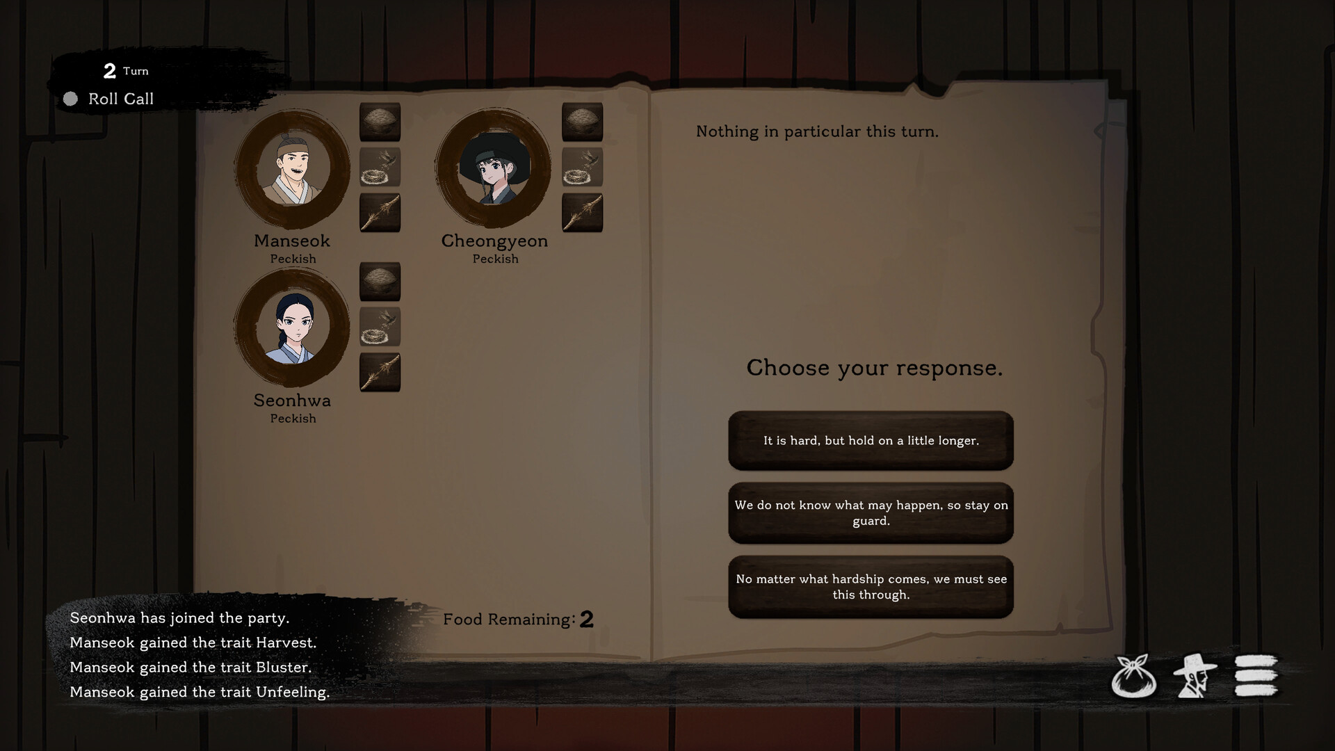 A Joseon-era survival strategy game where even goodwill becomes a resource. Manage companions and scarce supplies during a great famine. Every crucial decision is resolved by dice. There are no perfect choices—only surviving today and preparing for tomorrow.