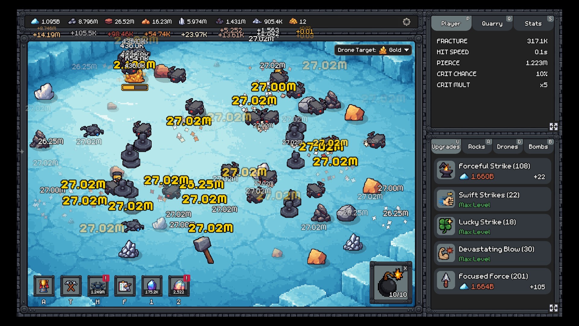 Fracture Field is an incremental quarry mining game. Shatter rocks with timed swings then invest your earnings into upgrades. Build a fleet of drones to automate your empire, bomb tough layers, and unlock powerful prestige upgrades on your journey to master the quarry.