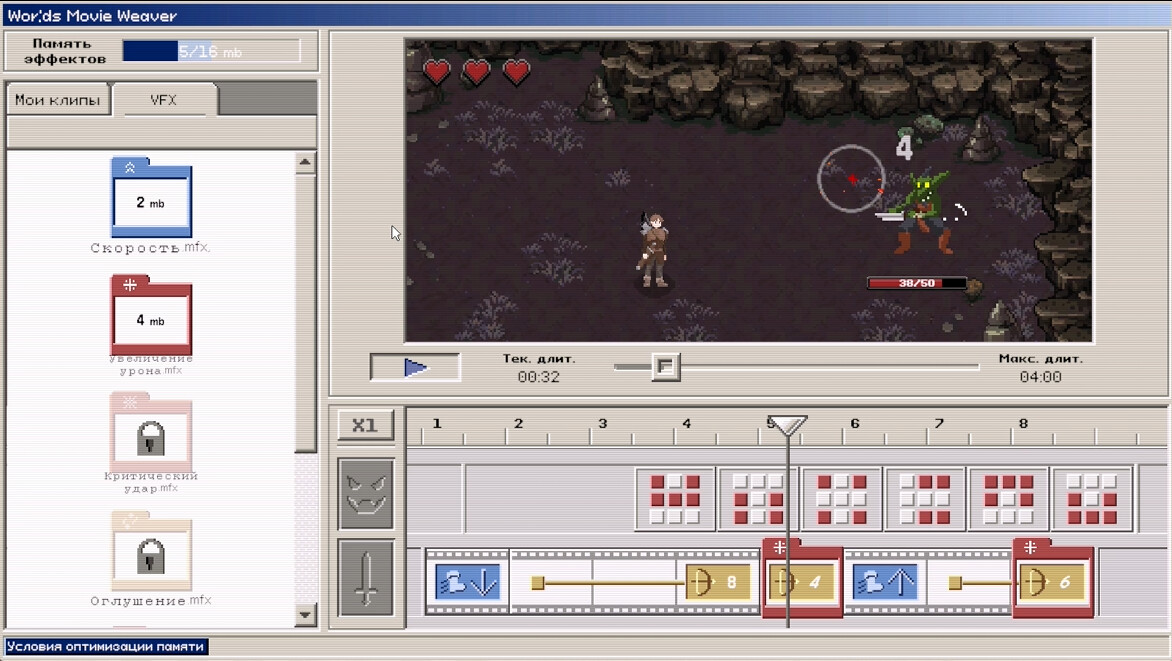 В видеоредакторе уже загружены записи вражеских атак и их действия. Перед началом боя изучите таймлайн, определите точки атак и подготовьте контрмеры.