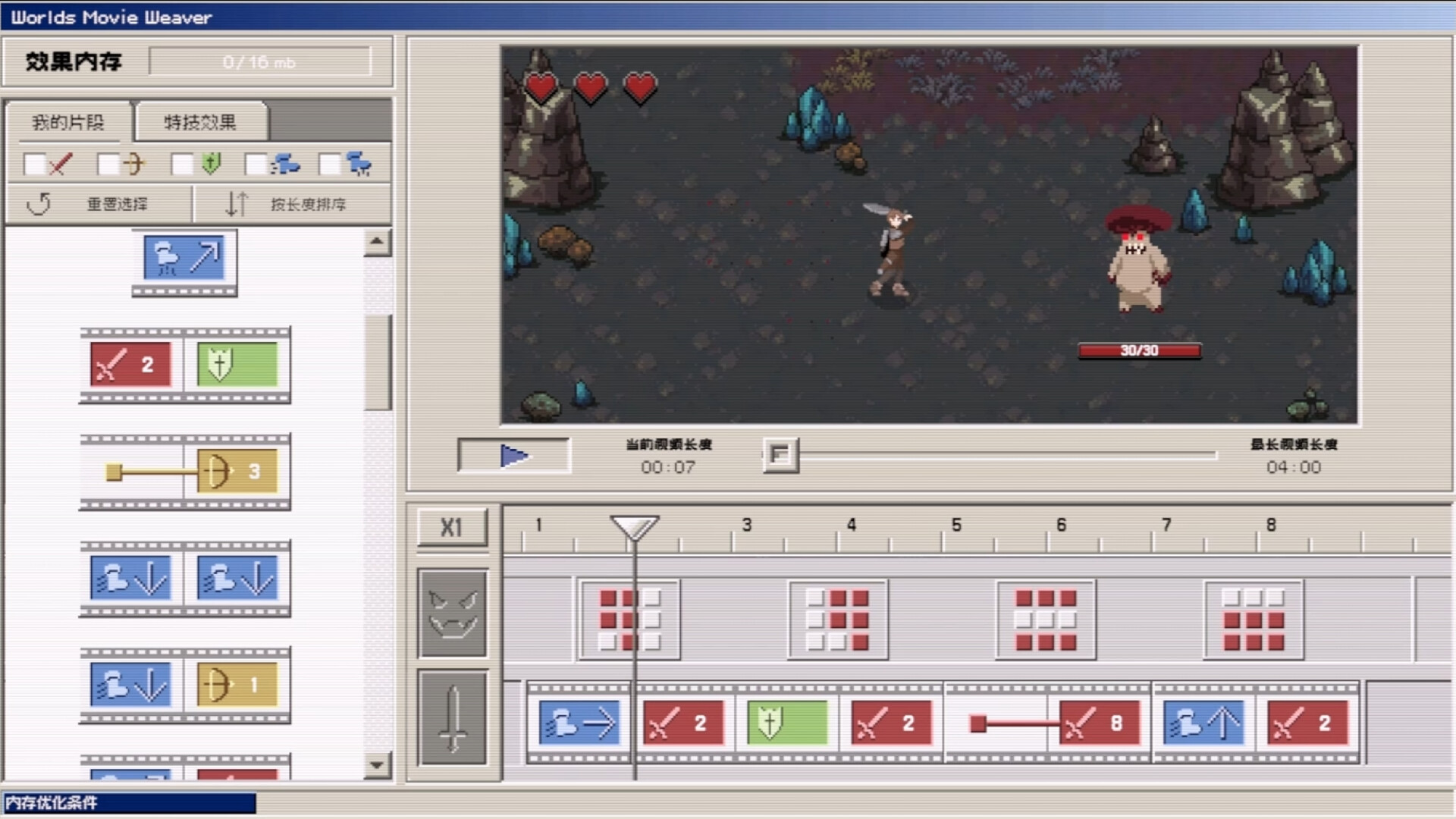 在 8 刻的时间轴上布置「移动」、「近战攻击」、「远程攻击」、「防御」片段,以此设计勇士的动作。