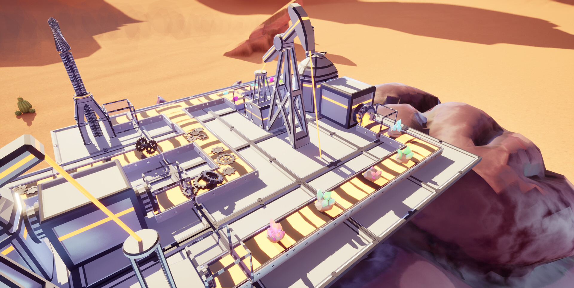Place extractors, route resources, and optimize your layout while the world keeps moving.