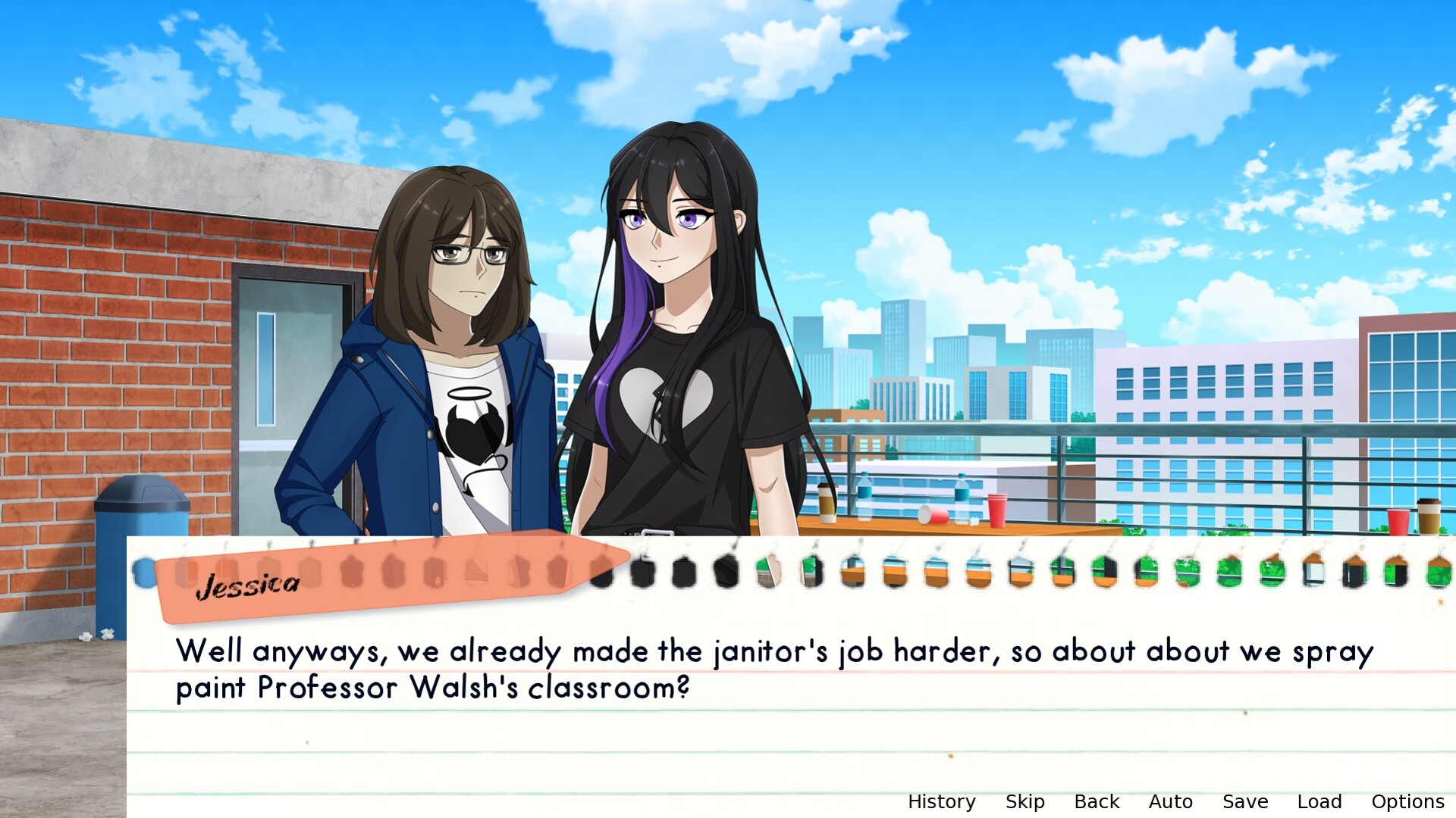• Character sprites with varied outfits and expressions