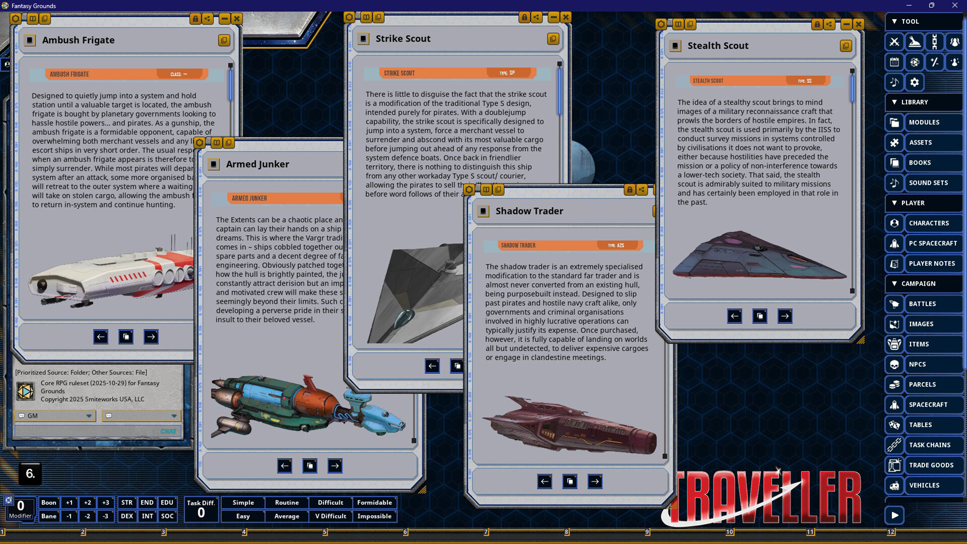 Requires: The free Fantasy Grounds virtual tabletop (VTT) software and a one time purchase of the Traveller 2E (Mongoose) ruleset.