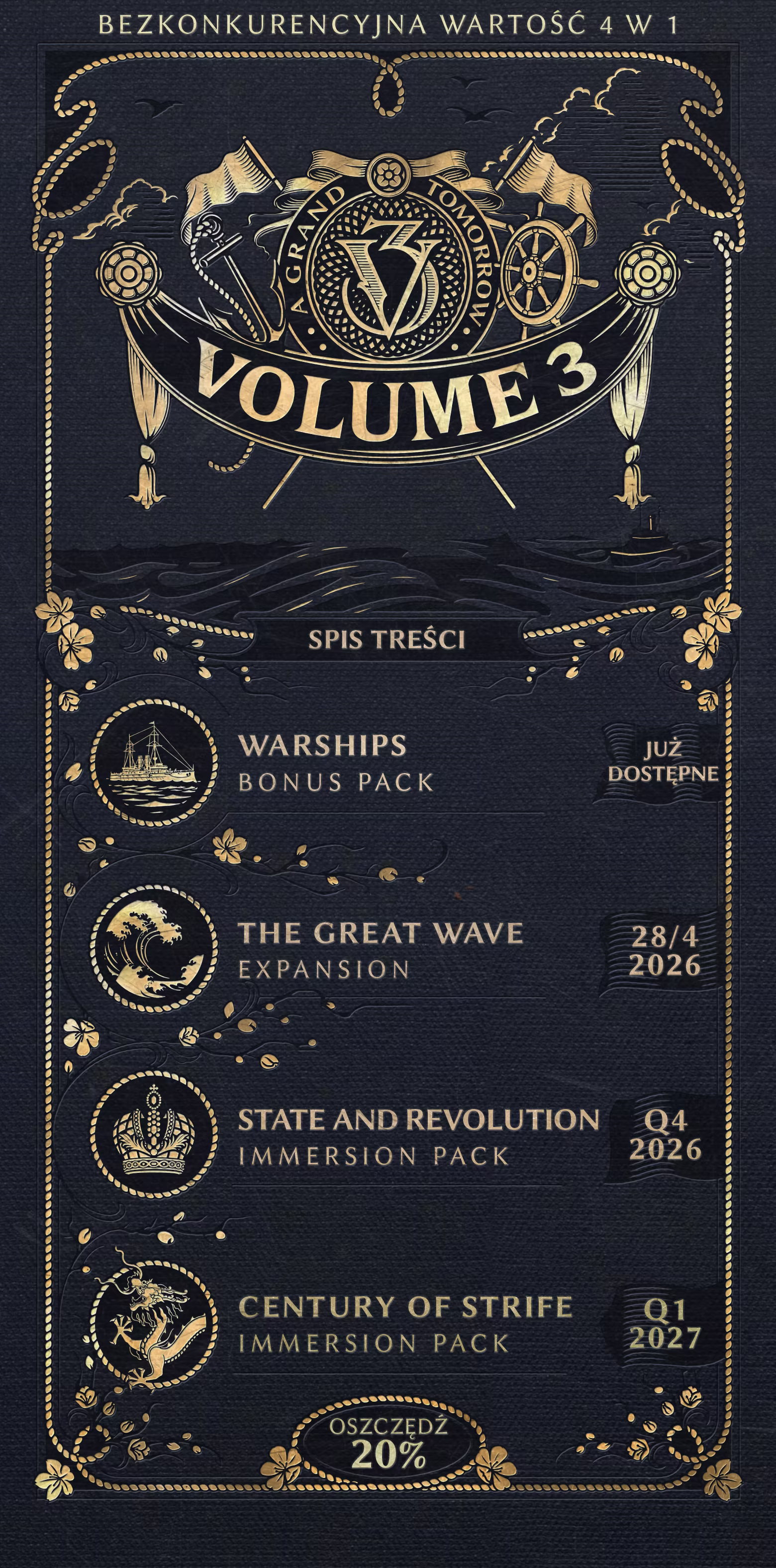 Budź strach wśród wrogów dzięki Warships Bonus Pack, pakietowi graficznemu dostępnemu od razu za darmo dla wszystkich, którzy kupią Victoria 3: Volume 3. Pakiet zawiera trzy nowe projekty okrętów reprezentujące na mapie pancerniki, które dominują na oceanach świata.