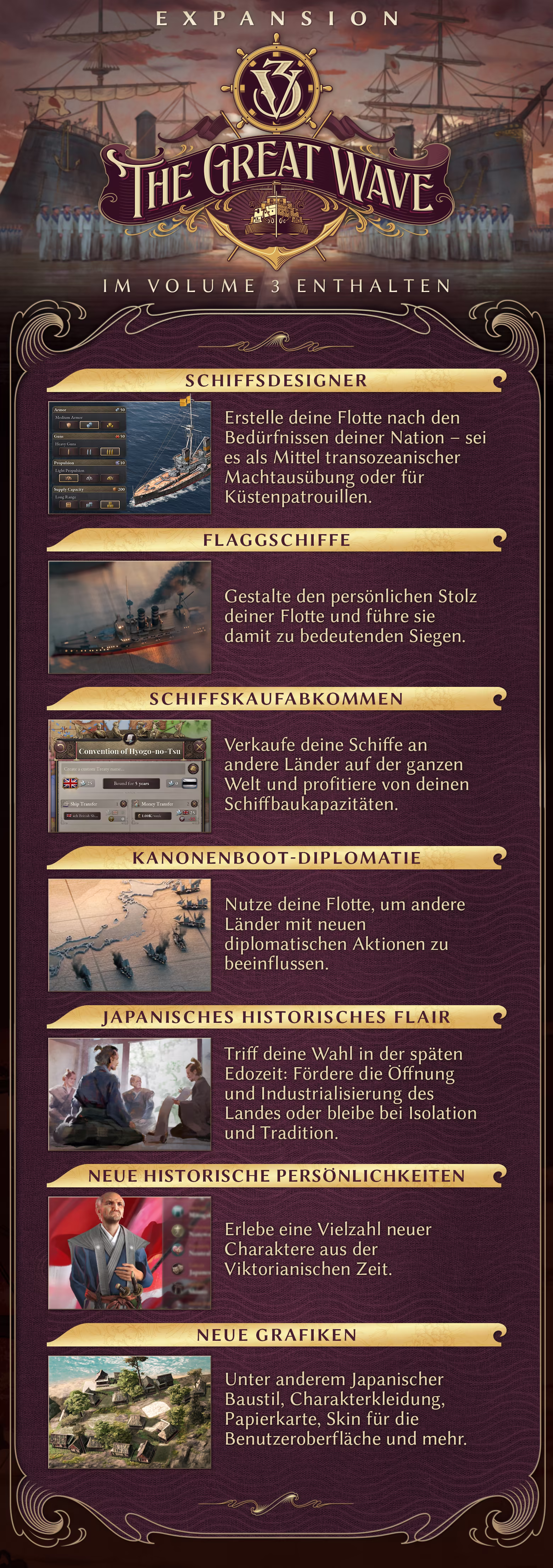 Beherrsche die Meere in einer Zeit von Ehrgeiz und Aufruhr! Gestalte mächtige Kriegsschiffe, beschütze die Meerengen der Welt und zwinge kleineren Mächten mit Kanonenboot-Diplomatie deinen Willen auf!