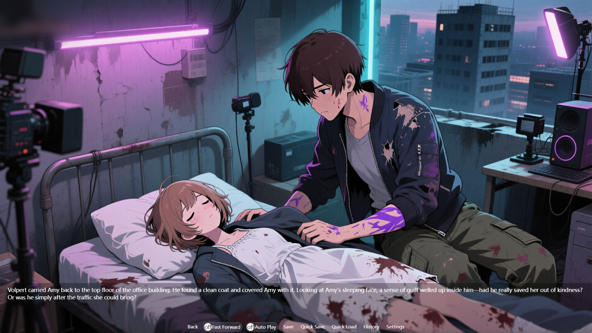 • In 2027, a gray-black dust shrouds the ruined city, and the plague of oblivion has raged for eighteen months. Survivors must rely on livestreaming to garner attention and slow their memory loss. You are Volpert, a second-tier livestreamer, your popularity dwindling, your memory index reduced to only 37%, and you could become a walking corpse at any moment. During an adventure, you encounter a severely infected, amnesiac girl. Her appearance causes a surge in viewership for your livestream, but it also draws you into a battle for viewership among top livestreamers, a dark conspiracy within the military, and the apocalyptic judgment of the infected leader. Lies and truth intertwine, survival and conscience clash. Will you succumb to the allure of false popularity and survive, or will you tear down the mask of revelry and seek redemption?