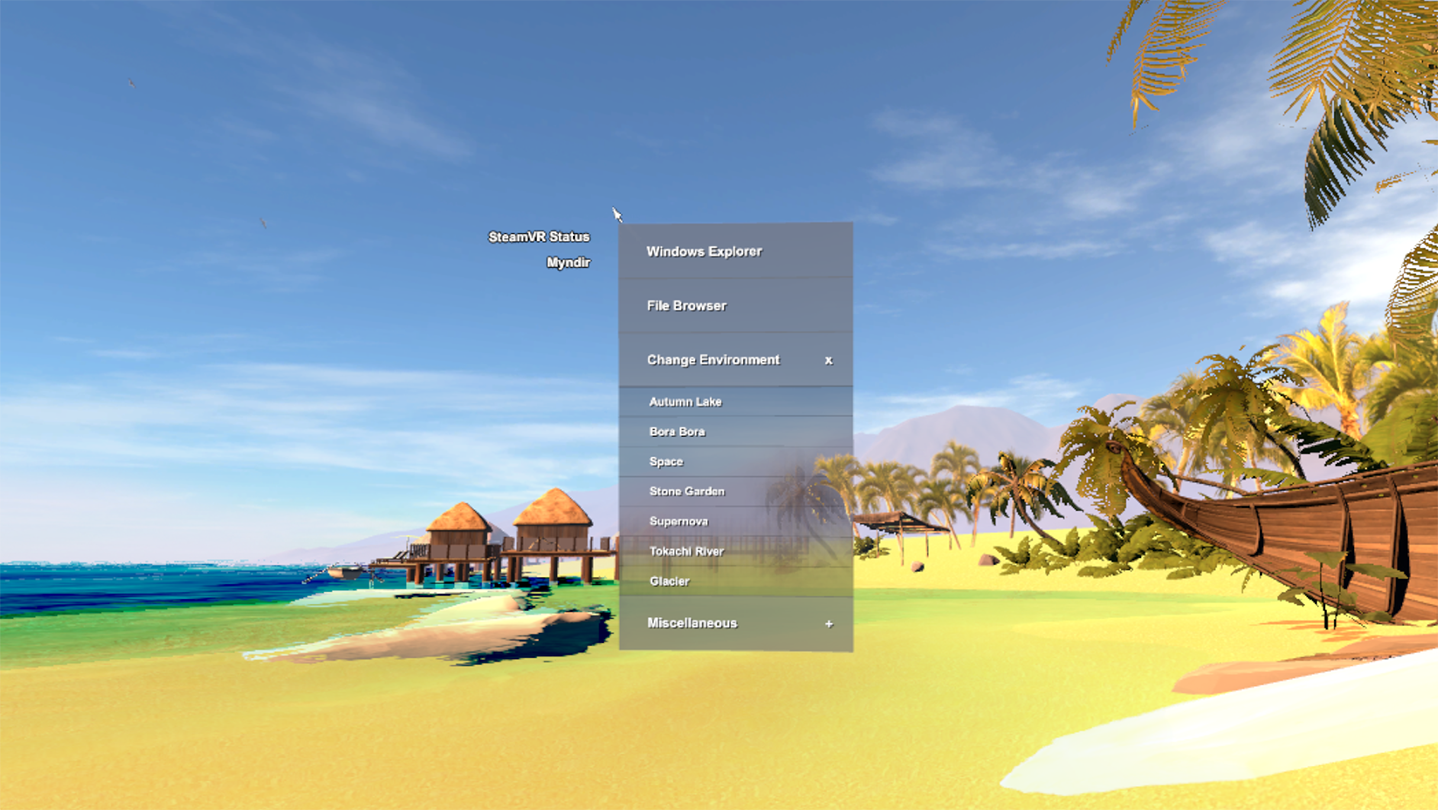 You start your experience with your mouse where you right click anywhere to see a menu. Use the menu to bring your open applications into Breakroom, open Windows Explorer or the Start Menu to open new applications. You can change backgrounds and skyboxes, rearrange your applications within Breakroom or open the tutorial.