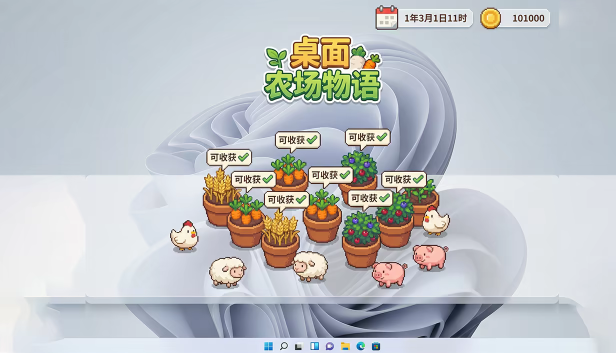 • Desktop interaction easter eggs: Farm animals will "scurry" to the desktop edge to nudge your mouse; ripe crops pop up cute alerts. No more boring desktops!