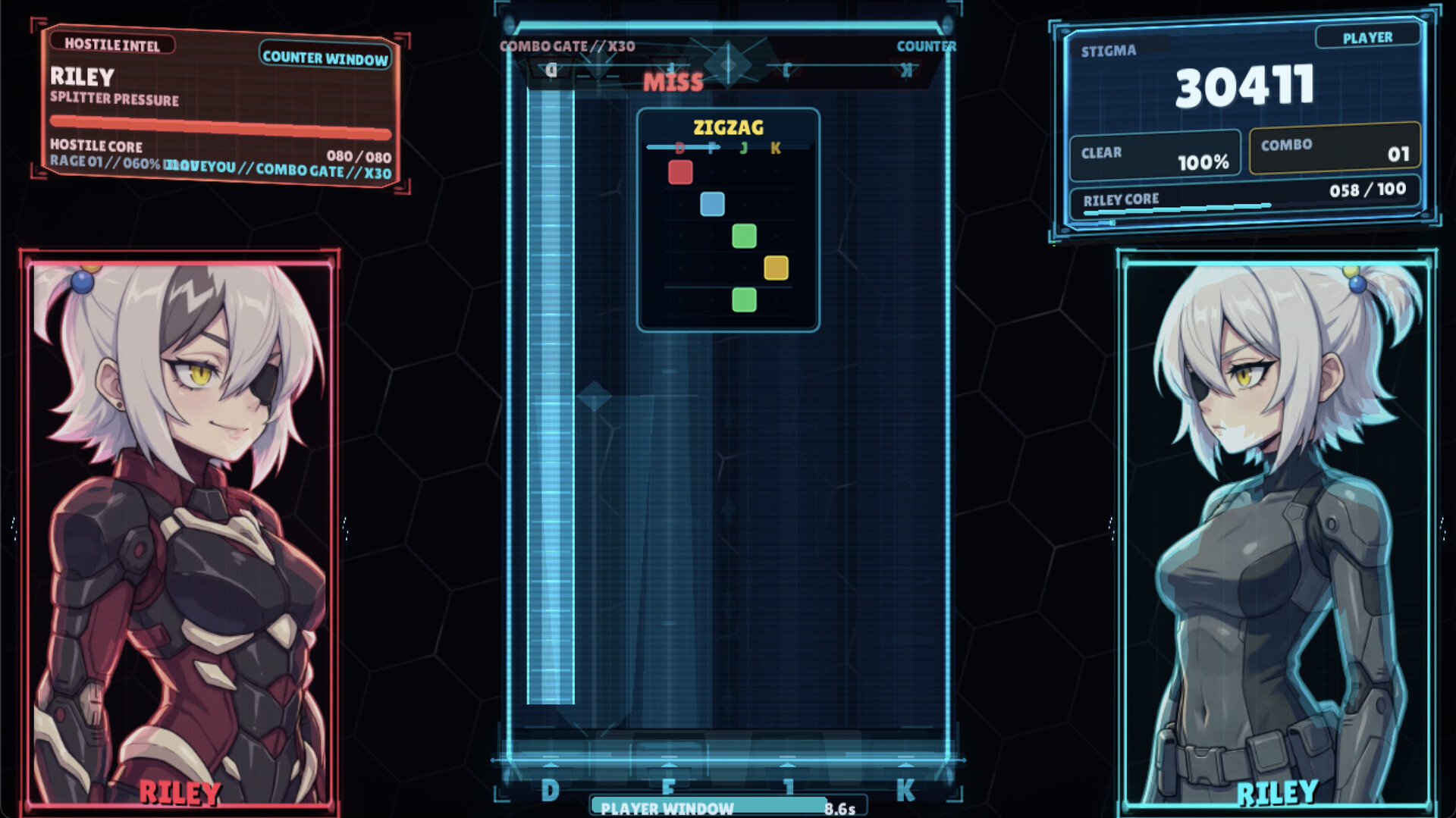 STIGMA features high-quality 2D illustrations and animations of female characters. Some characters are depicted in revealing, tight-fitting tactical outfits such as high-cut leotards and bodysuits, with partial nudity and suggestive posing. The game also contains stylized fantasy violence as players engage in rhythmic combat against digital entities known as "Noise."