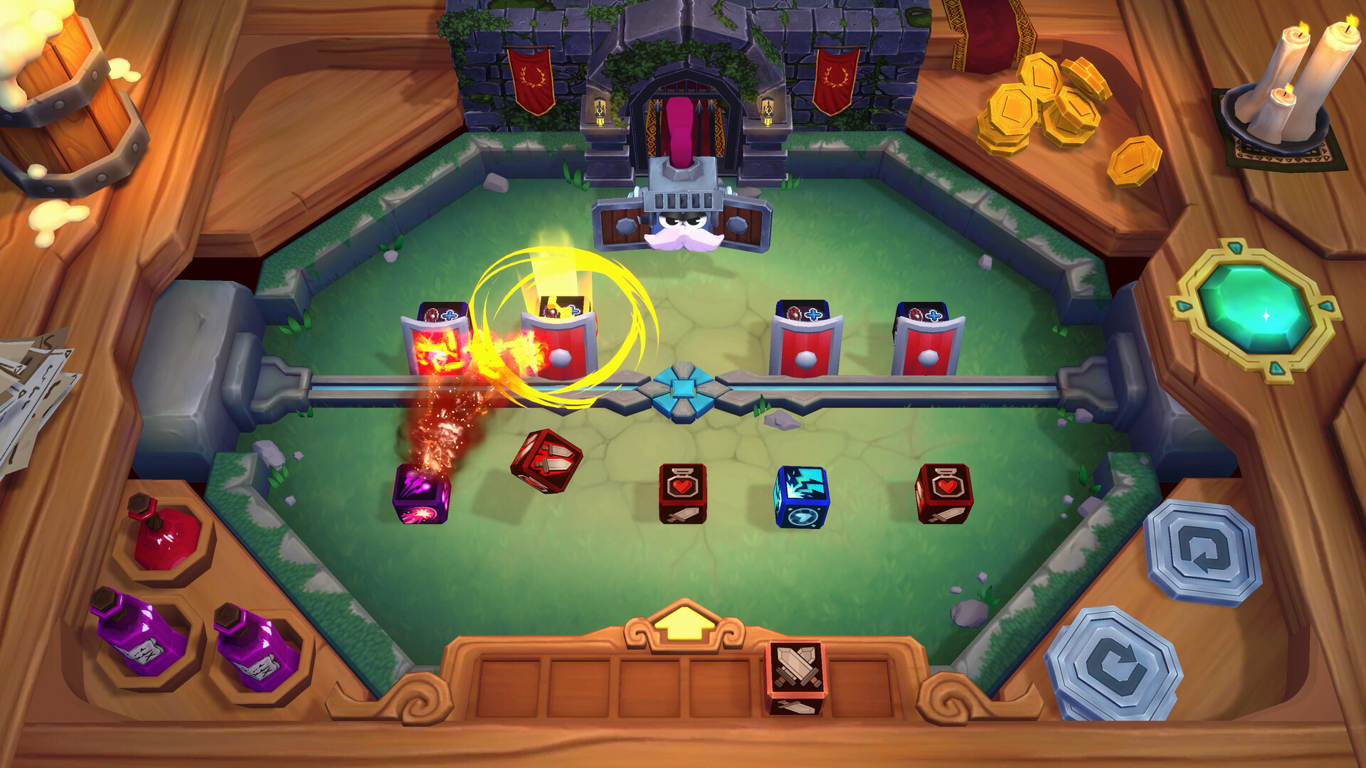 Battles play out automatically, but artifacts let you intervene. Catapult launches dice at backline threats or ballista takes out the last foe. Timing these tools can turn a losing fight into victory.